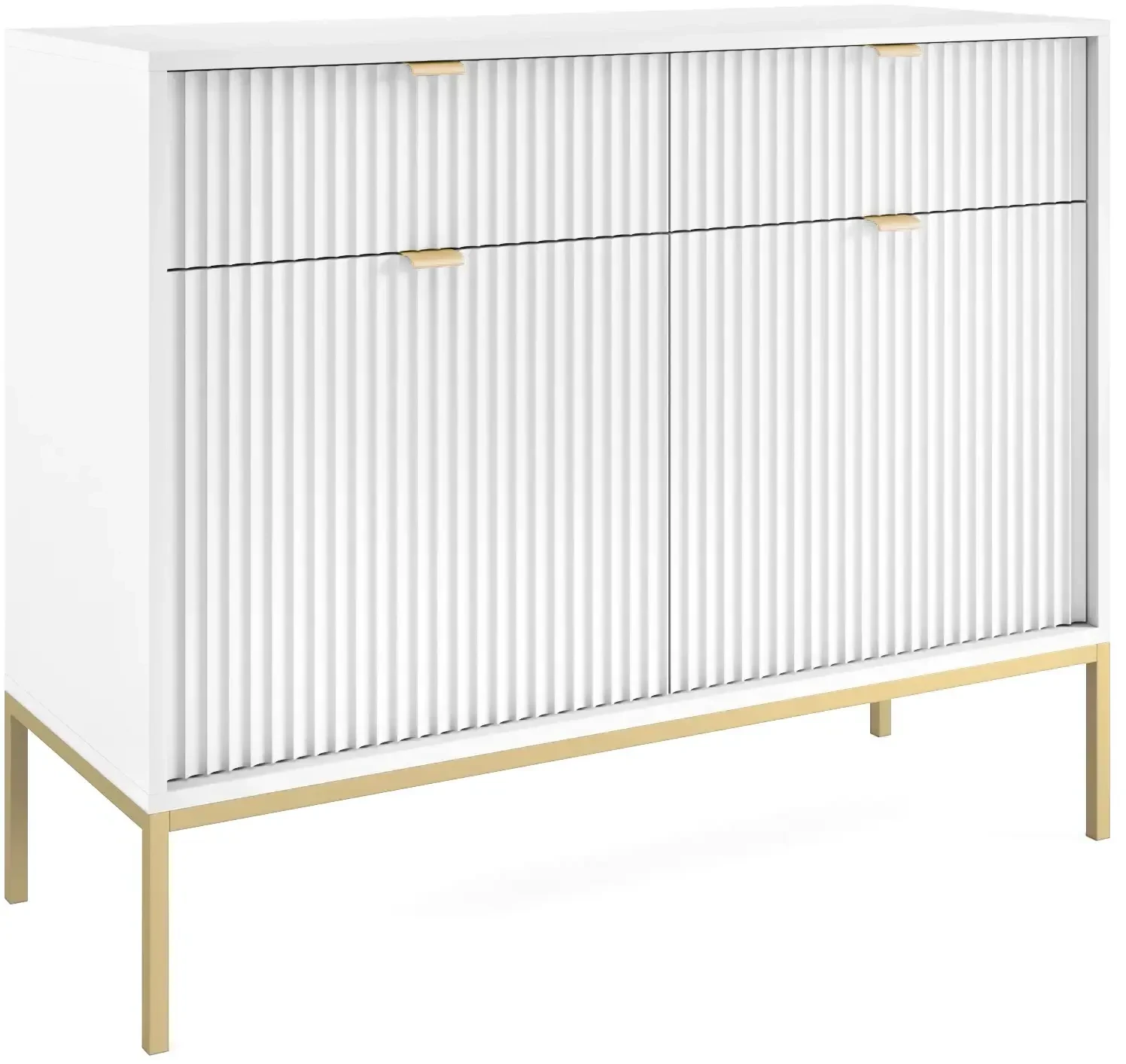 Komoda Novo to pojemny i nowoczesny mebel. Komoda została wyposażona w pojemne półki i szuflady, dzięki czemu stanowi idealne miejsce do przechowywania ubrań oraz pozostałych elementów garderoby, takich jak czapki, szale itp. Komoda sprawdzi się zarówno w salonie, sypialni, jak też pokoju młodzieżowym czy przedpokoju. Nowoczesny, minimalistyczny design połączony z delikatnym białym kolorem sprawia, że komoda Nova prezentuje się niezwykle stylowo i nowocześnie. Prosta ale elegancka forma z dekoracyjnym ryflowaniem na frontach to must have dla miłośników nowoczesnego designu. Metalowa podstawa nadaje lekkości konstrukcji a całości dopełniają ozdobne uchwyty w kolorze złotym. Mebel został zaprojektowany i wykonany w Polsce co jest gwarancją jakości - Wspieraj