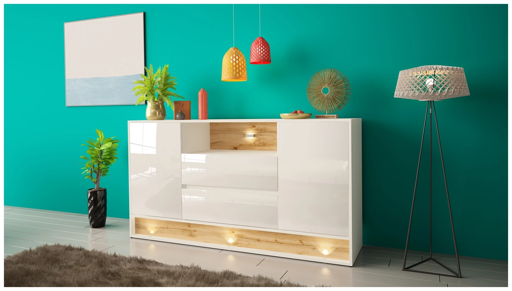 Komoda VISION 02 z LED to stylowy i nowoczesny mebel, który doda elegancji każdemu salonowi. Oferuje ona 160 cm szerokości, co zapewnia dużo przestrzeni do przechowywania. Jej wyjątkowy design łączy matowe i błyszczące powierzchnie w kolorach białym i wotan, co dodaje jej unikalnego charakteru. Zastosowanie oświetlenia LED nie tylko podkreśla nowoczesny wygląd szafki, ale również tworzy przyjemną atmosferę w pomieszczeniu. Dodatkowo, lakierowane fronty są łatwe w czyszczeniu i zapewniają trwałość oraz odporność na codzienne użytkowanie.