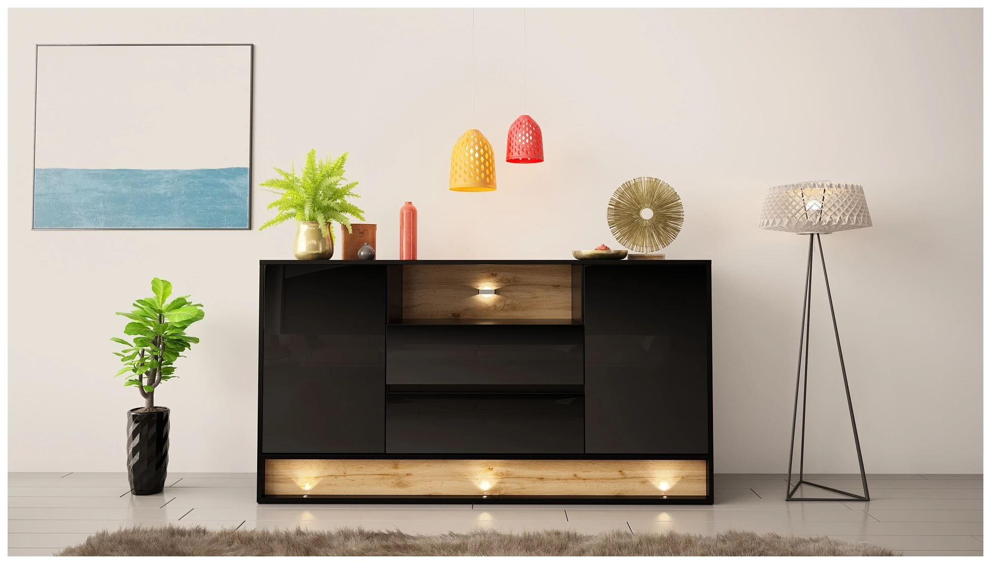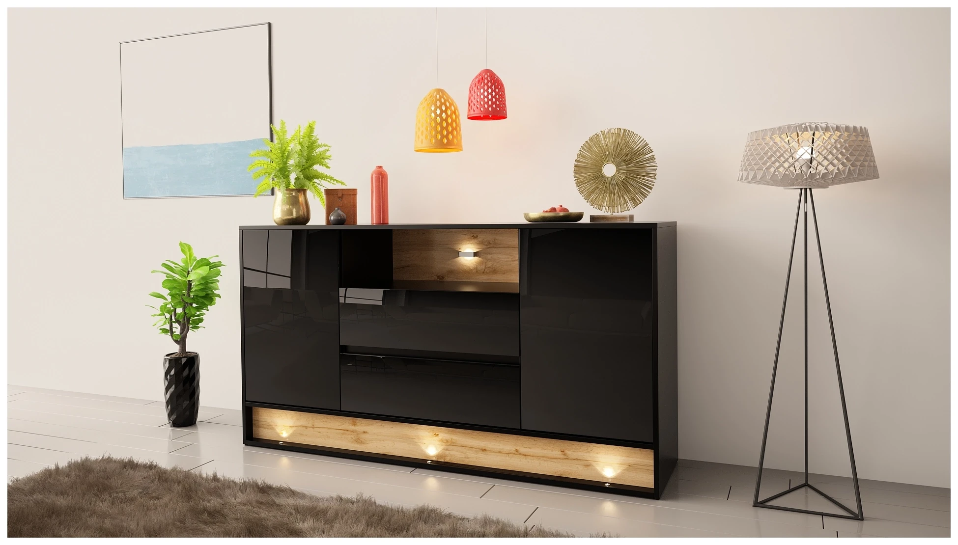 Komoda VISION 02 z LED to stylowy i nowoczesny mebel, który doda elegancji każdemu salonowi. Oferuje ona 160 cm szerokości, co zapewnia dużo przestrzeni do przechowywania. Jej wyjątkowy design łączy matowe i błyszczące powierzchnie w kolorach czarnym i wotan, co dodaje jej unikalnego charakteru. Zastosowanie oświetlenia LED nie tylko podkreśla nowoczesny wygląd szafki, ale również tworzy przyjemną atmosferę w pomieszczeniu. Dodatkowo, lakierowane fronty są łatwe w czyszczeniu i zapewniają trwałość oraz odporność na codzienne użytkowanie.