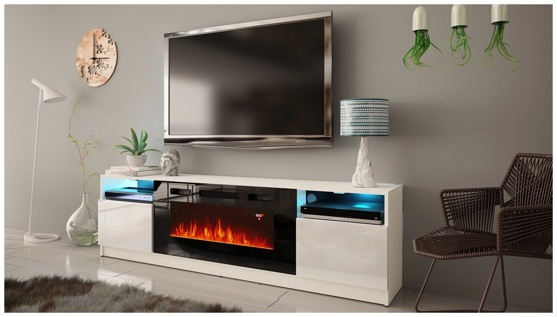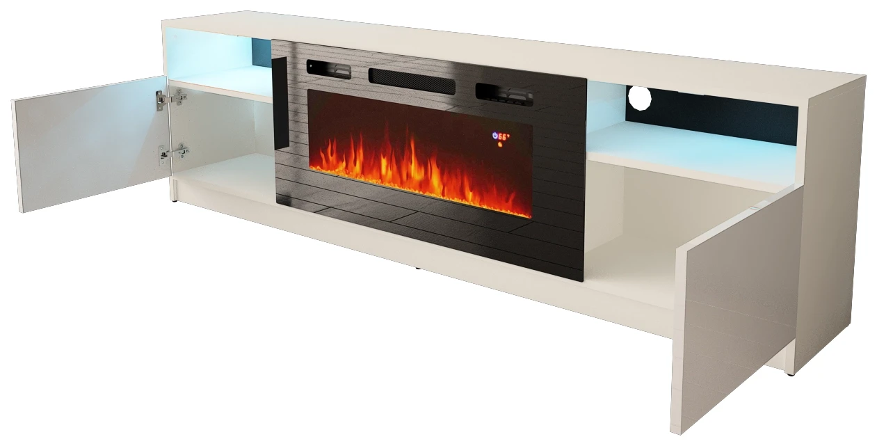 Szafka RTV YORK 02 z kominkiem i LED 200 cm biały mat/połysk