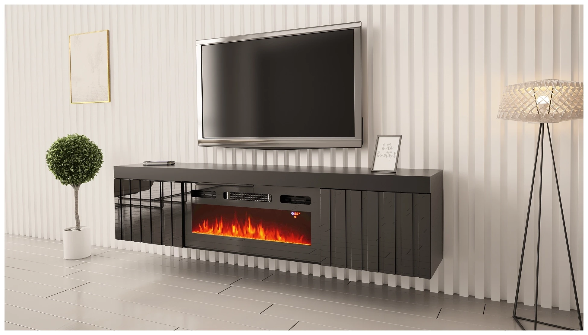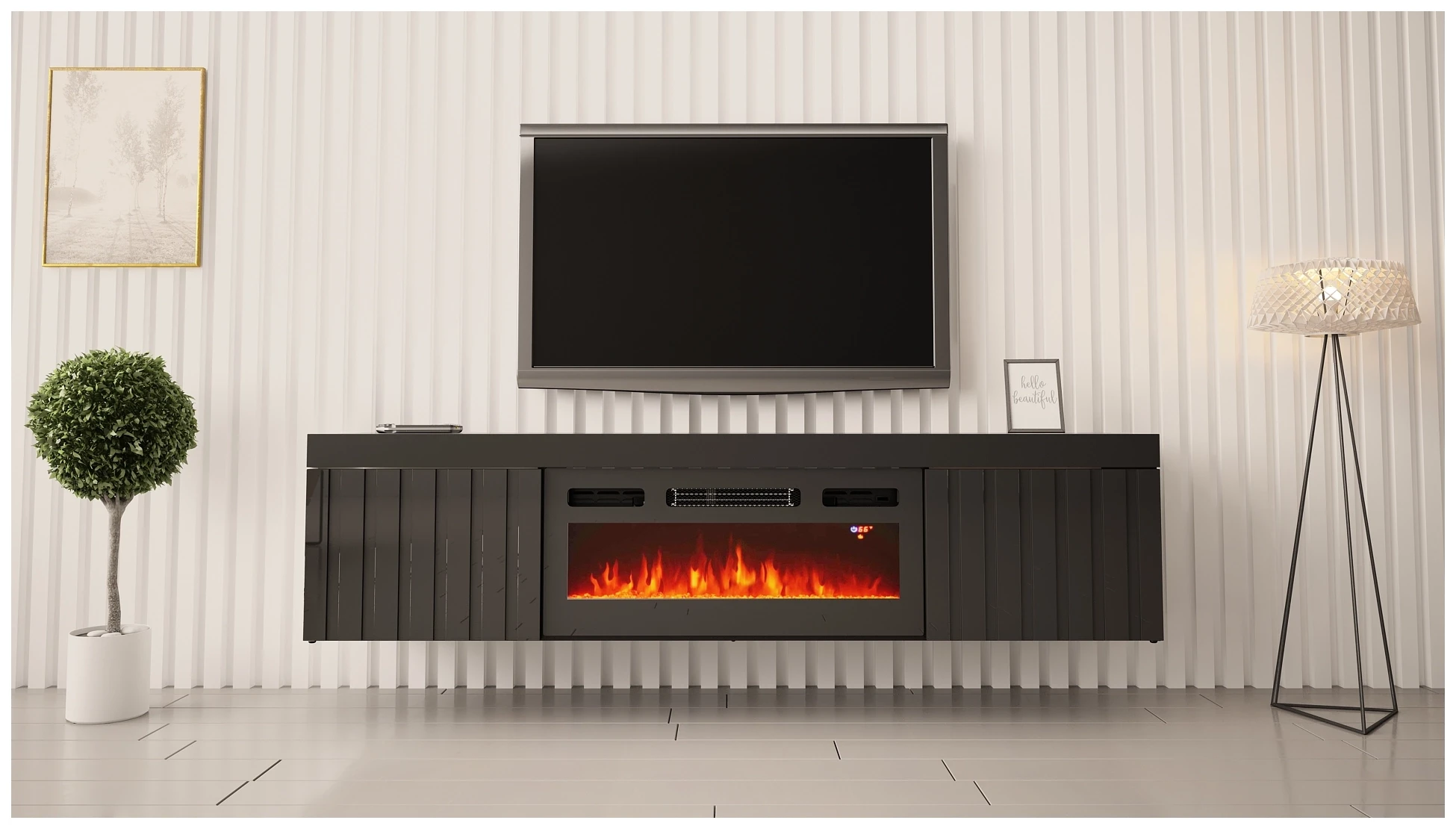 Szafka RTV KNOXVILLE 02 z elektrycznym kominkiem to nie tylko mebel, ale centrum domowego ciepła i stylu. Jej nowoczesny design i efekt 3D na ryflowanych frontach dodają wnętrzu wyjątkowej głębi i elegancji. Wisząca konstrukcja optymalizuje przestrzeń, nadaje lekkości, zajmuje mniej miejsca i sprawia, że pomieszczenie wydaje się większe a jednocześnie jest wyrazem współczesnych trendów w designie. Wbudowany kominek elektryczny stwarza przytulną atmosferę, idealną do relaksu po długim dniu, a jednocześnie jest bezpieczny i ekologiczny w użyciu.