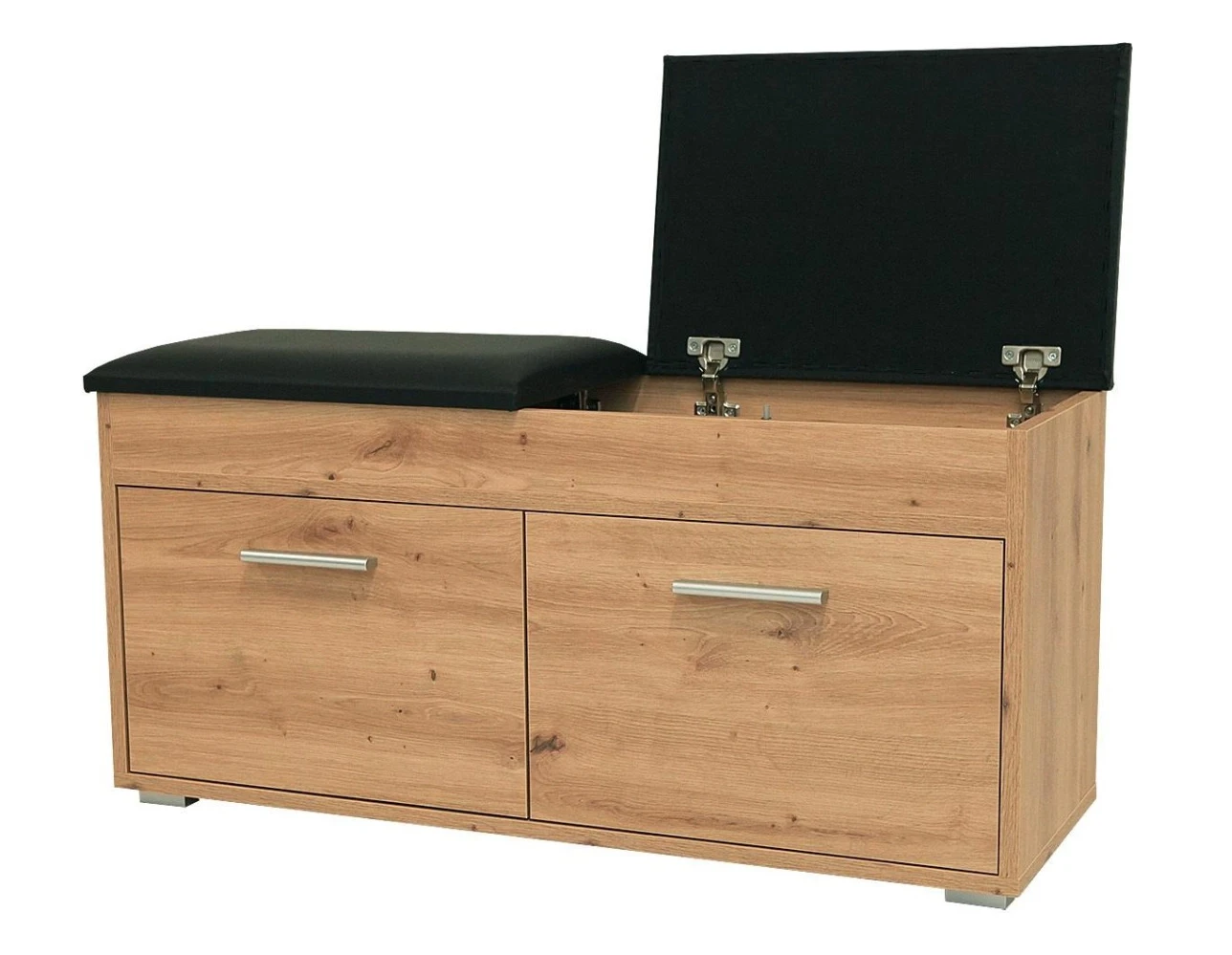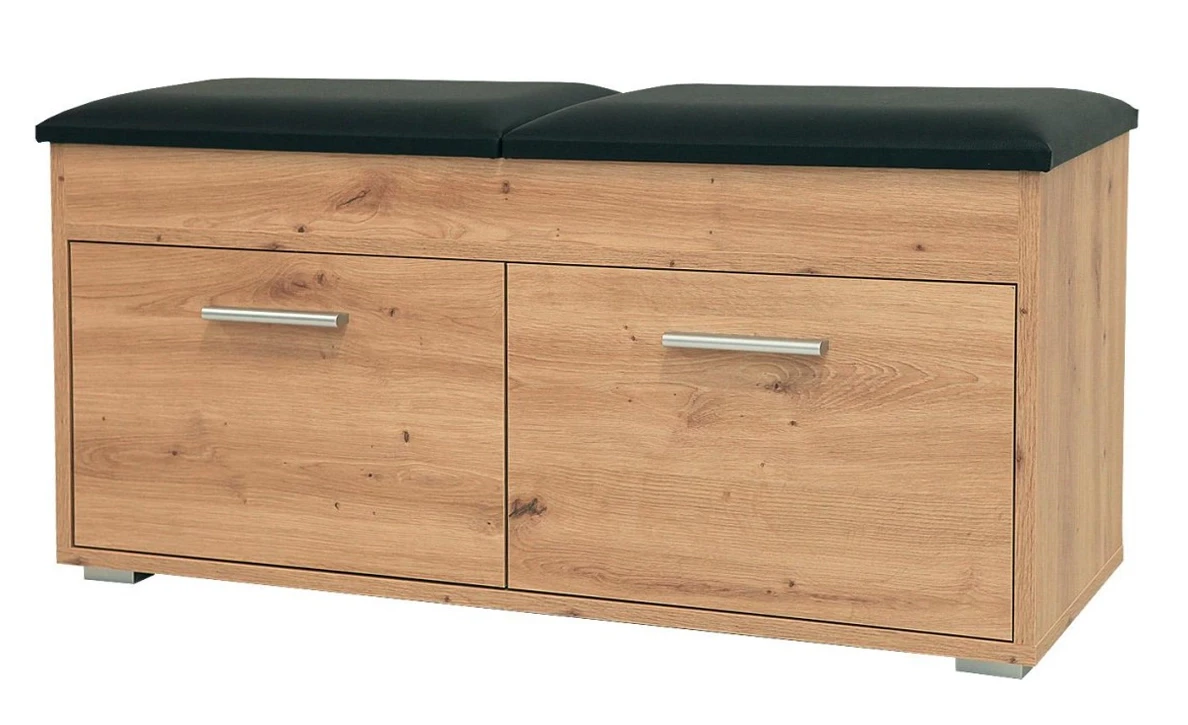 Sora to praktyczna szafka na buty z siedziskiem tapicerowanym, która pomieści około 8-9 par butów. Nowoczesna szafka na buty świetnie sprawdzi się w każdym przedpokoju i pomoże w uporządkowaniu miejsca przeznaczonego na przechowywanie obuwia. Wygodne, miękkie siedzisko wykonane z czarnego skaju umożliwia komfortowe ściąganie i wkładanie obuwia. Szafka na buty z półkami to praktyczne i funkcjonalne rozwiązanie, gdyż oprócz obuwia, można z powodzeniem przechowywać w niej również inne, podręczne rzeczy, jak np. środki do czyszczenia obuwia. Szafka na buty Sora posiada również dodatkowy schowek do przechowywania drobnych przedmiotów.