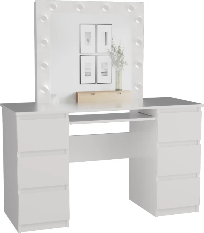 - sześć pojemnych szuflad: oferują one obszerną przestrzeń do przechowywania, pozwalając na organizację i łatwy dostęp do wszystkich Twoich kosmetyków, akcesoriów i biżuterii. Utrzymują porządek i pomagają zachować czystość na blacie toaletki.