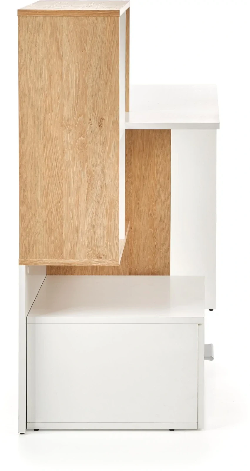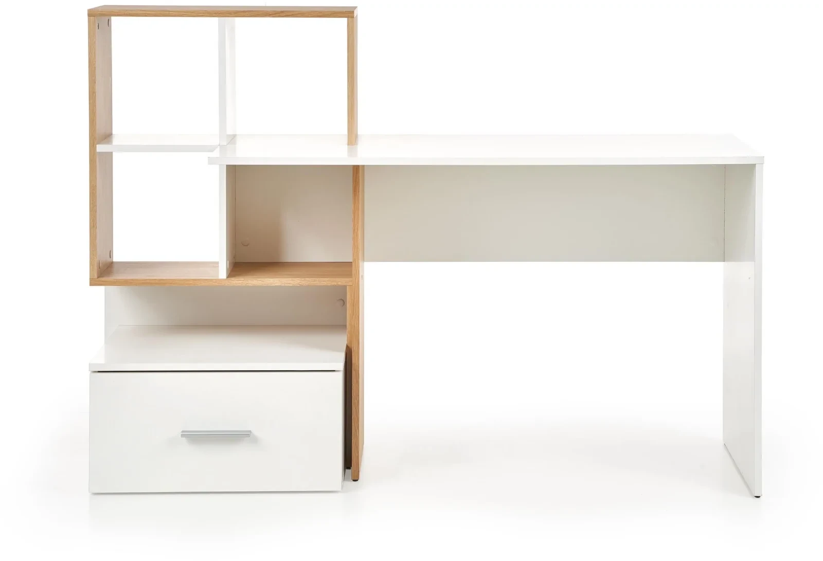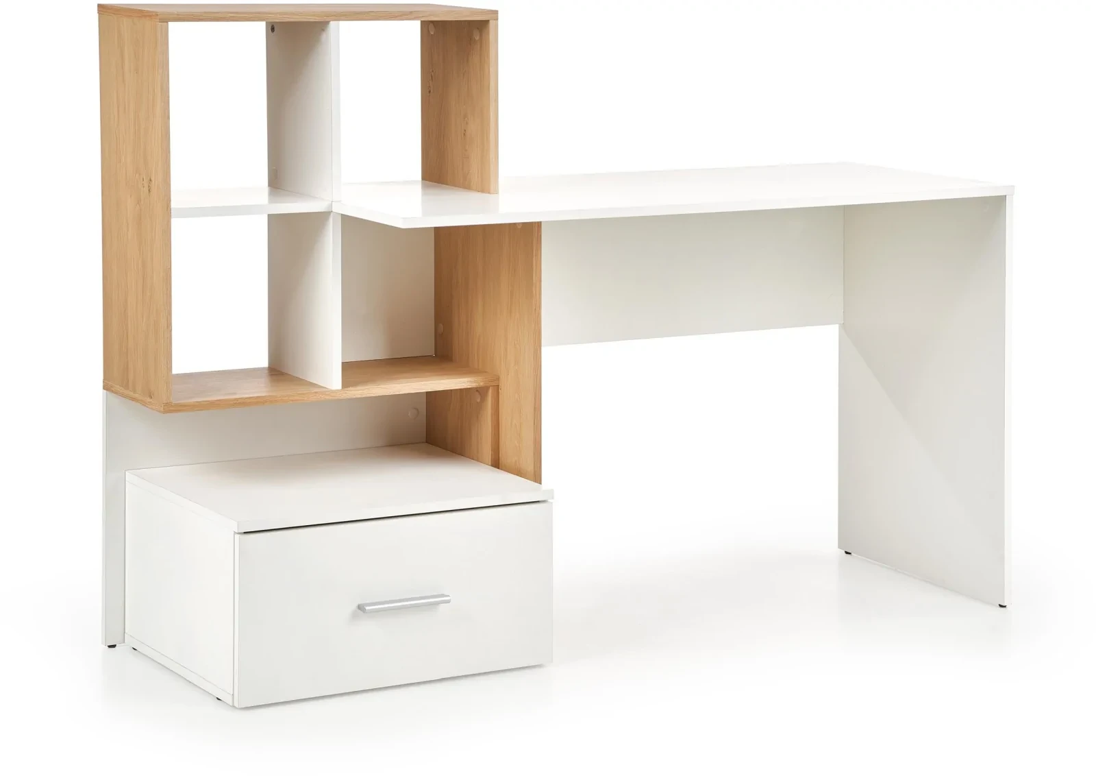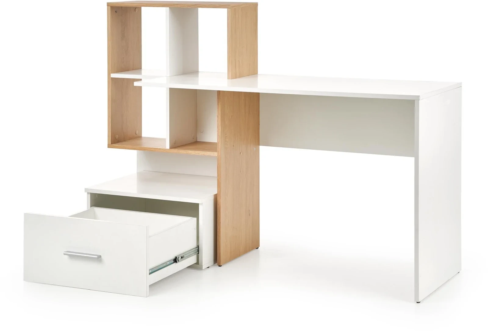 Estetyka biurka Grasso to połączenie białego laminatu z elementami w kolorze dębu złotego, które nadają meblowi nowoczesny, a jednocześnie ciepły charakter. Taka kolorystyka wspaniale komponuje się z różnymi stylami wnętrzarskimi, od nowoczesnych po bardziej klasyczne aranżacje.
