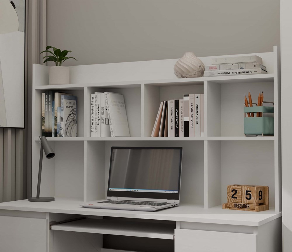Zestaw biurka KUBA z nadstawką w eleganckim, matowym białym wykończeniu to idealne rozwiązanie dla młodzieży oraz osób ceniących funkcjonalność i spójną estetykę przestrzeni pracy. Minimalistyczny design bez uchwytów, trwała konstrukcja z laminowanej płyty 16 mm oraz stylowy look sprawiają, że mebel świetnie wpisuje się we współczesne wnętrza. Nadstawka z półkami harmonijnie uzupełnia biurko, tworząc miejscem do przechowywania książek lub dekoracji, a sześć szuflad i wysuwana półka na klawiaturę poprawiają komfort pracy i organizację.