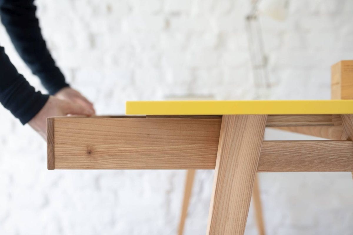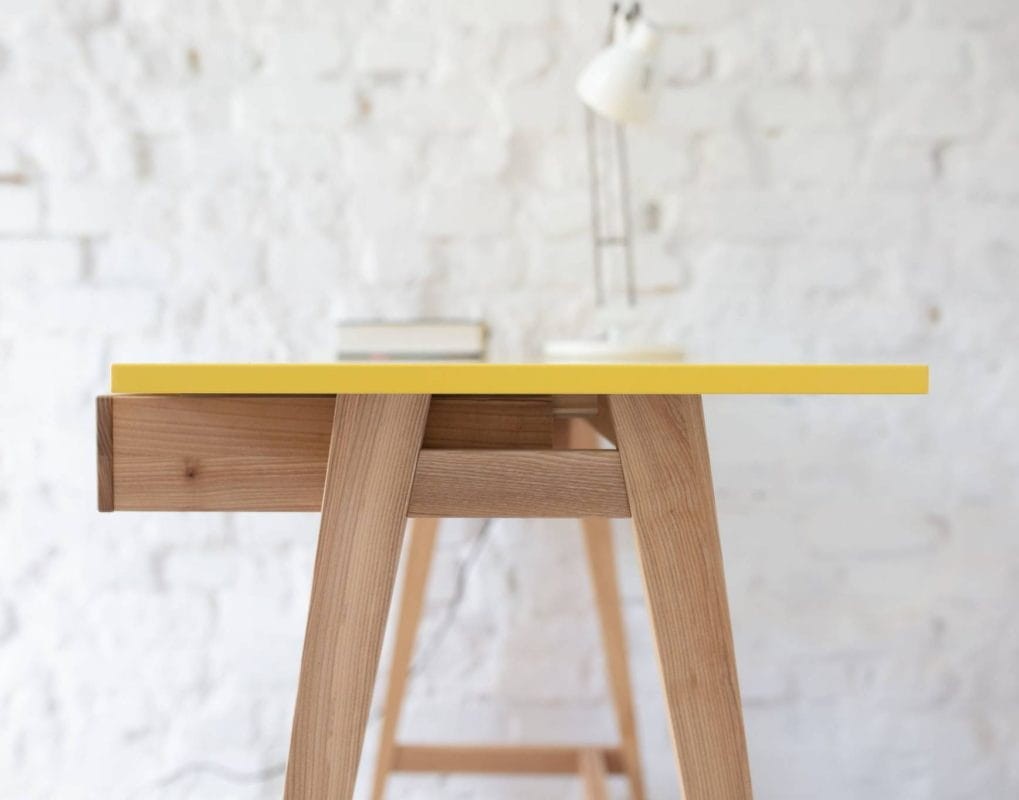 Dostępne jest w 3 wariantach szerokości (65 cm, 85 cm, 110 cm), w dwóch kolorach podstawy (jesion lub dąb) oraz w wielu kolorach blatu co pozwala na stworzenie niepowtarzalnego oraz unikatowego mebla.