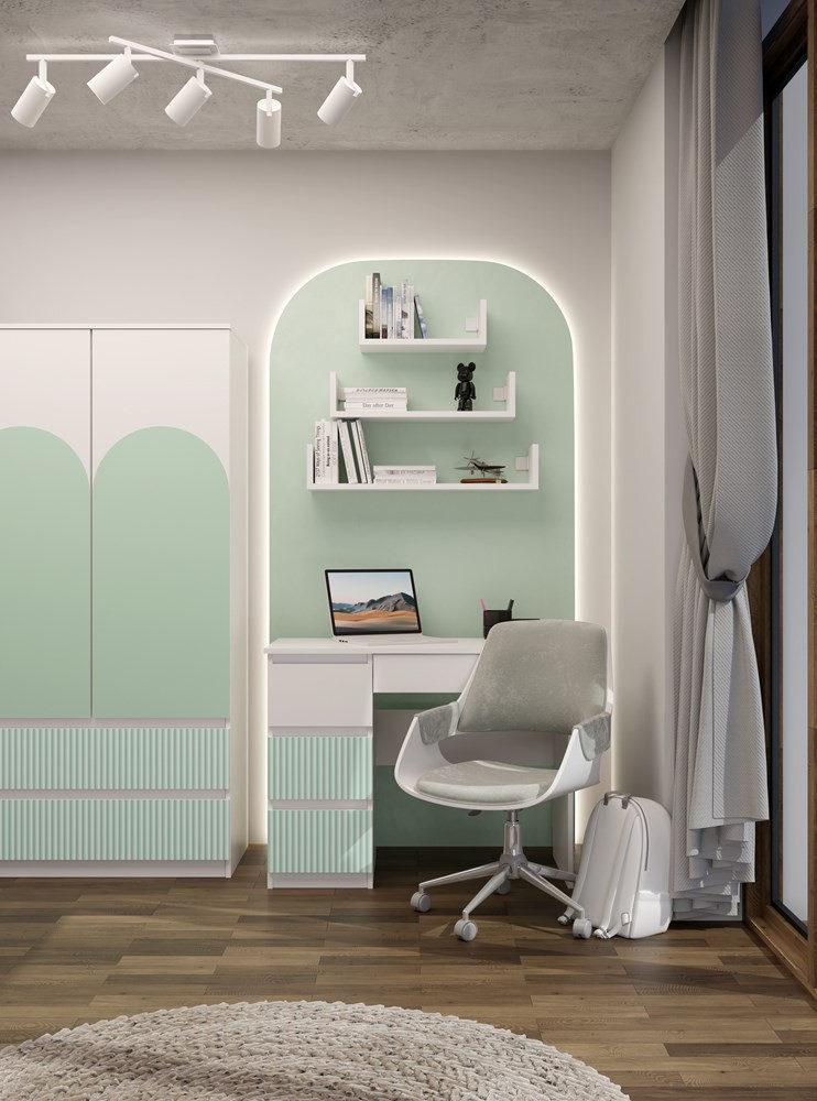 Nowoczesne i funkcjonalne biurko MIJAS ARTESO (wariant lewy w kolorze biały/miętowy) to idealne wsparcie dla dzieci i młodzieży. Łączy estetyczny design i praktyczność – dzięki laminowanej płycie o grubości 16 mm i bezuchwytowym frontom w miętowym odcieniu z subtelnym wzorem, wnosi do wnętrza świeżość i harmonię, a jednocześnie zapewnia wygodną przestrzeń do nauki, zabawy i korzystania z laptopa.