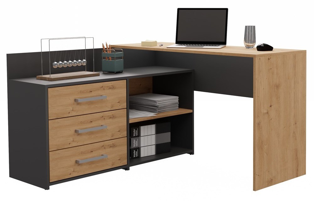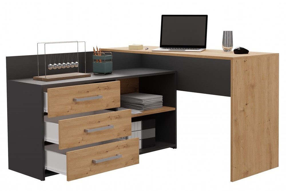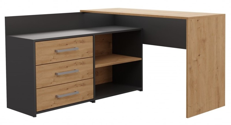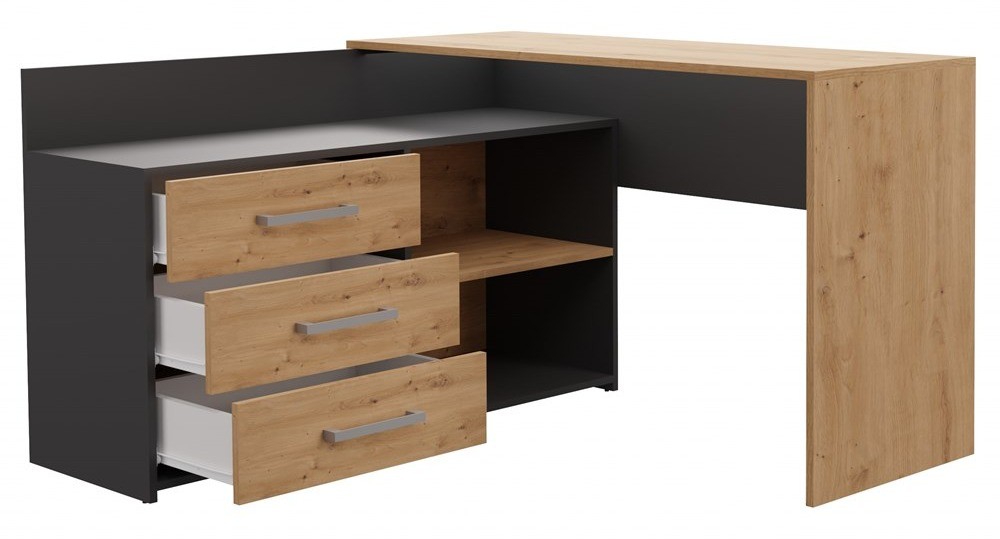 Biurko narożne DANY w kolorystyce antracyt/dąb artisan to stylowe i funkcjonalne rozwiązanie zarówno do pokoju dziecięcego, jak i domowego biura. Mebel o nowoczesnym, matowym wykończeniu doskonale wpisuje się w aktualne trendy aranżacyjne, łącząc elegancję z praktycznością. Trzy pojemne szuflady, solidna konstrukcja i komfortowy blat w kształcie litery L tworzą ergonomiczne stanowisko pracy, zapewniające wygodę i miejsce na niezbędne akcesoria.