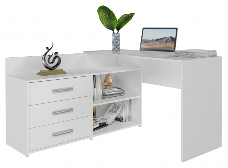 Biurko narożne DANY w eleganckim, matowym odcieniu bieli to połączenie funkcjonalności i nowoczesnego designu – idealne rozwiązanie do pokoju dziecięcego, młodzieżowego i domowego biura. Kształt litery L optymalizuje przestrzeń roboczą, a trzy pojemne szuflady zapewniają porządek i wygodę podczas codziennej pracy czy nauki.
