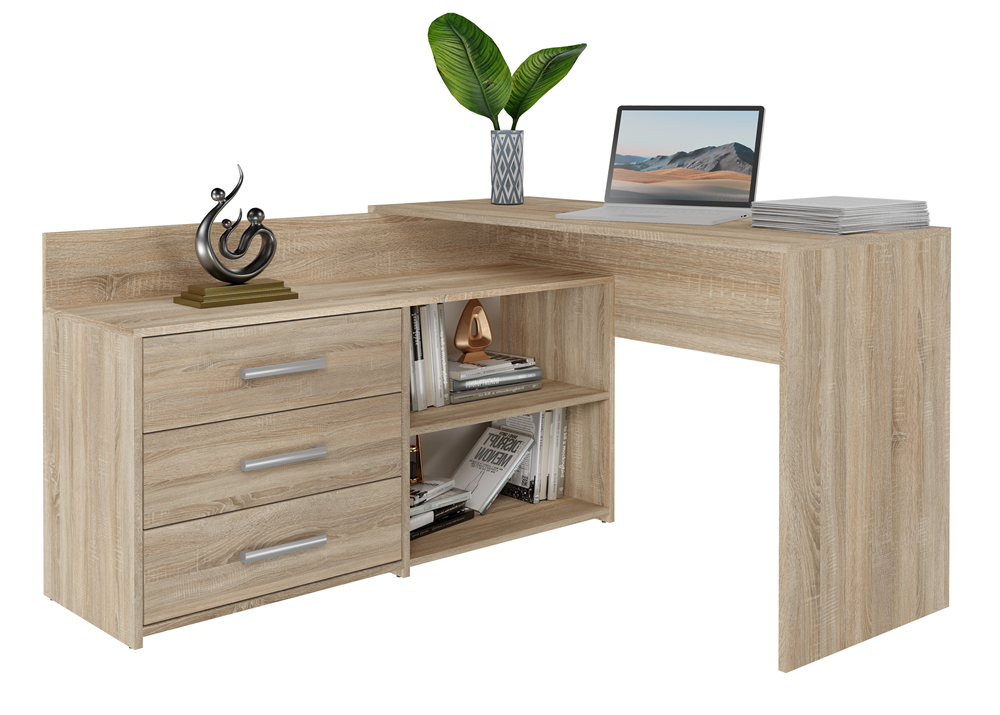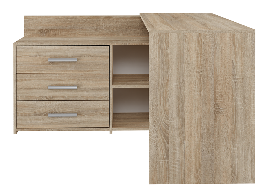 Biurko narożne DANY w dekorze dąb sonoma, z matowym wykończeniem, to połączenie nowoczesnego stylu i funkcjonalności. Rama w formie litery L oraz równoległa komoda z trzema szufladami tworzą wygodne i uporządkowane miejsce pracy – doskonałe dla dzieci, młodzieży i dorosłych pracujących zdalnie.