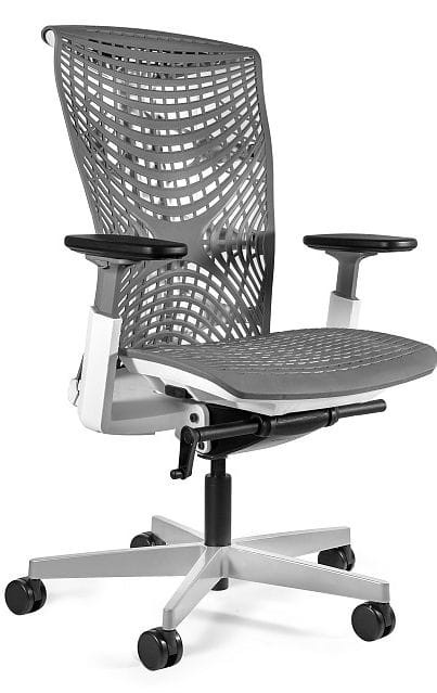 - Innowacyjne siedzisko z wewnętrznym układem sprężyn spiralnych, tapicerowane szarym elastomerem