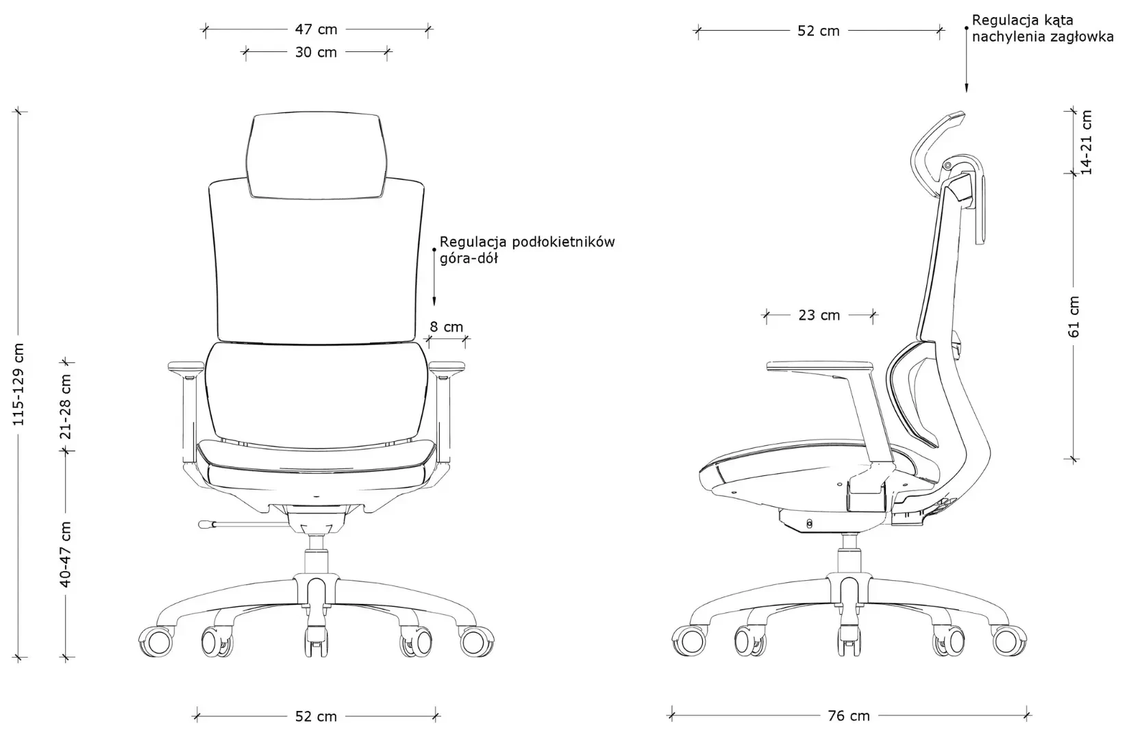 - Regulowane podłokietniki (góra-dół)