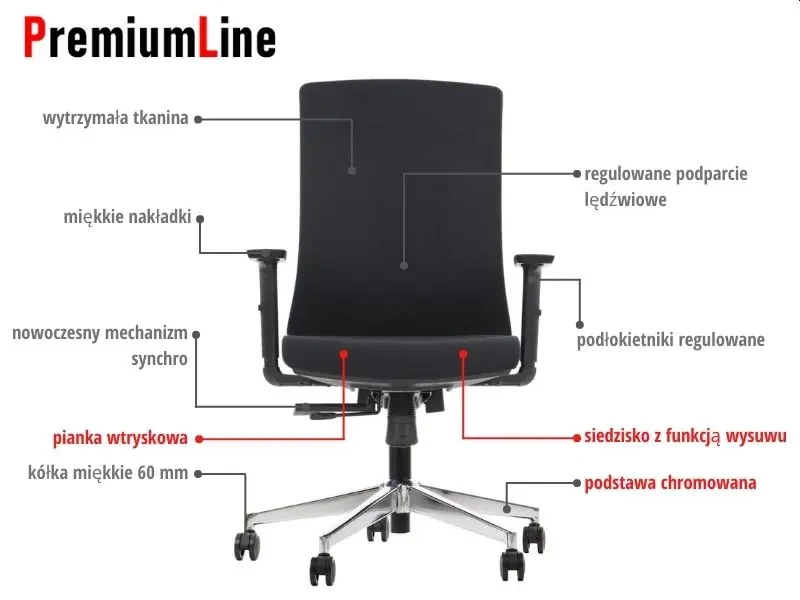 - Oparcie z regulowanym wyprofilowaniem lędźwiowym - gwarantuje wygodę siedzenia podczas wielogodzinnej pracy