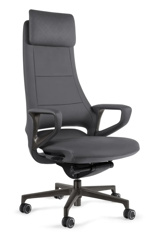 - Podłokietniki wykonane ze szczotkowanego aluminium posiadają miękkie nakładki z eko-skóry