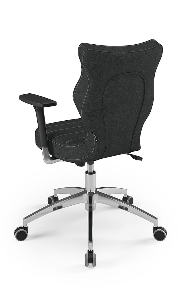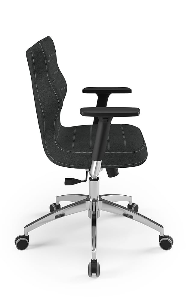 Fotel biurowy Perto Alu Deco to elegancka propozycja fotela tak do biura jak i gabinetu, wyposażona w tapicerkę w stonowanych kolorach oraz obrotową podstawę i regulowane podłokietniki z miękką, przesuwną nakładką. Komfortowe i ergonomiczne siedzisko tapicerowane jest wytrzymałą tkaniną i dzięki gazowemu podnośnikowi pozwala płynnie ustawić odpowiednią dla użytkownika pozycję przed biurkiem. Profilowane oparcie jest miękkie, ale jednocześnie wymusza odpowiednią pozycję pleców, dzięki czemu pozwala zmniejszyć ryzyko powstawania wad postawy. Podstawa jezdna wykonana z aluminium posiada miękkie kółka pozwalające użytkować krzesło tak na miękkich dywanach, jak twardych parkietach.