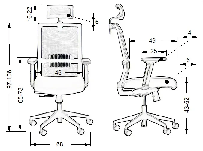 - Wysokość podłokietnika: 19 - 28 cm