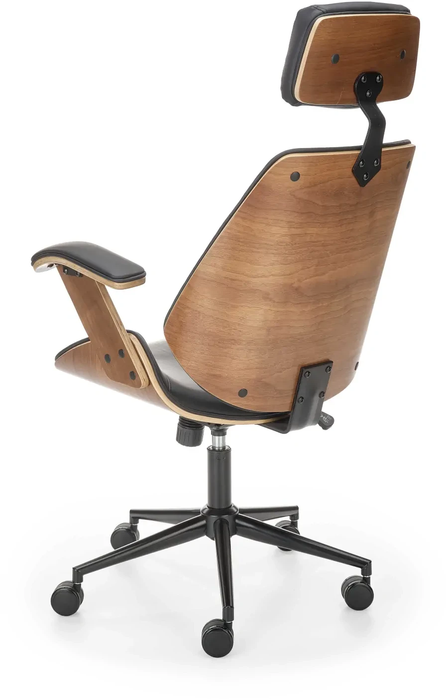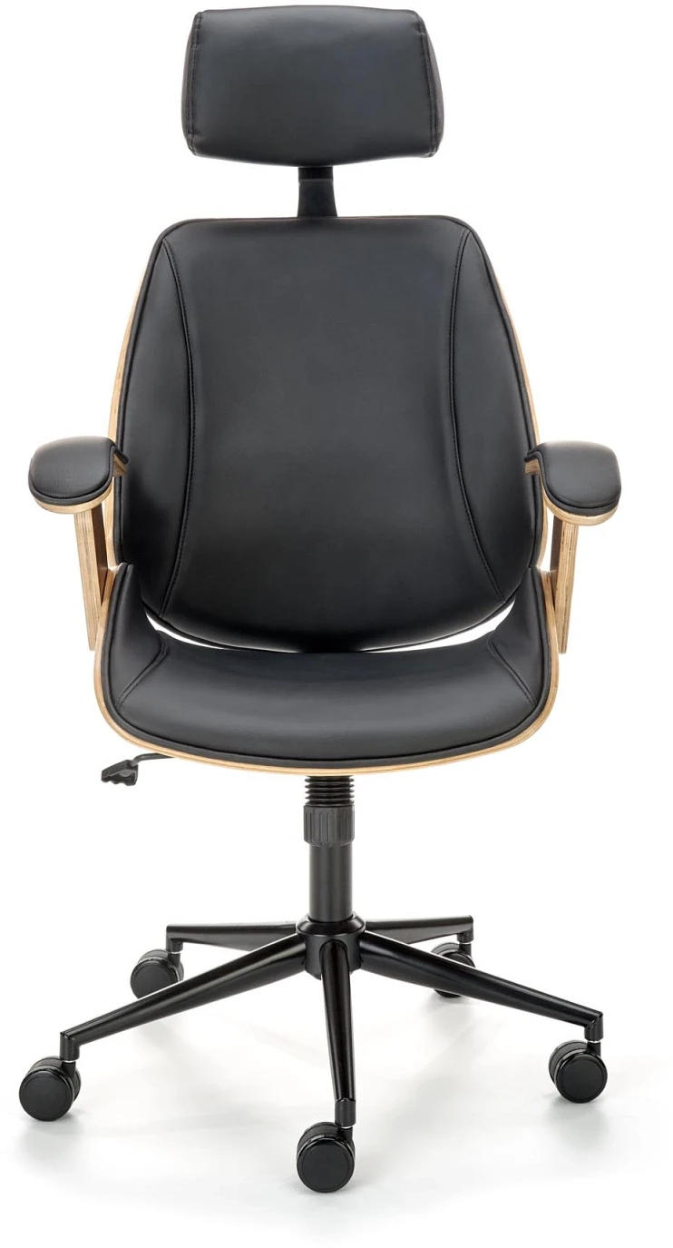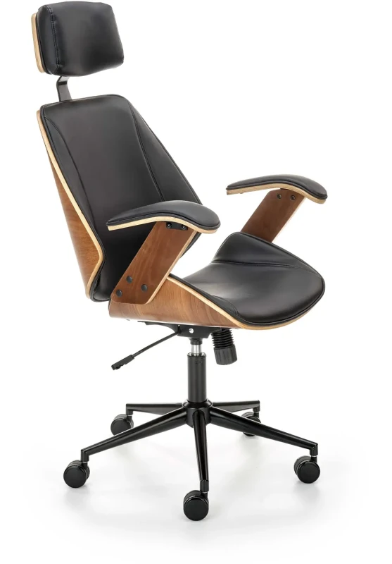 - Stylowy design: Połączenie czarnej eco skóry z wykończeniem w kolorze orzechowym nadaje fotelowi elegancki wygląd, który doskonale komponuje się z różnymi stylami wnętrzarskimi, od klasycznego po nowoczesny. Fotel ten nie tylko podnosi komfort pracy, ale także stanowi stylowy element wystroju wnętrza.