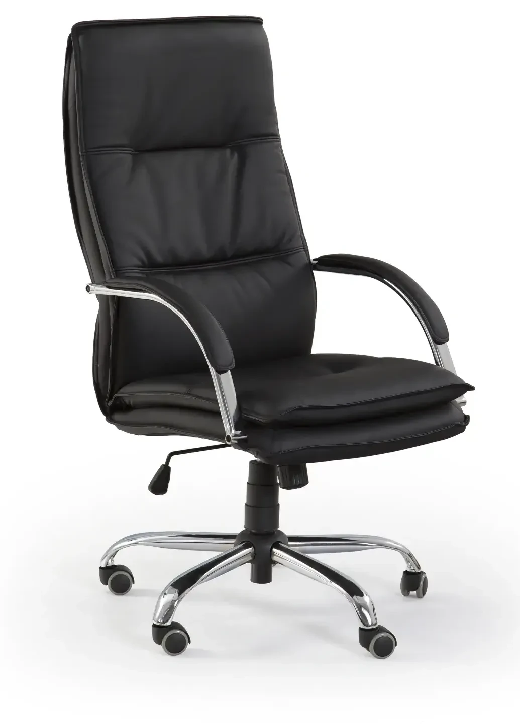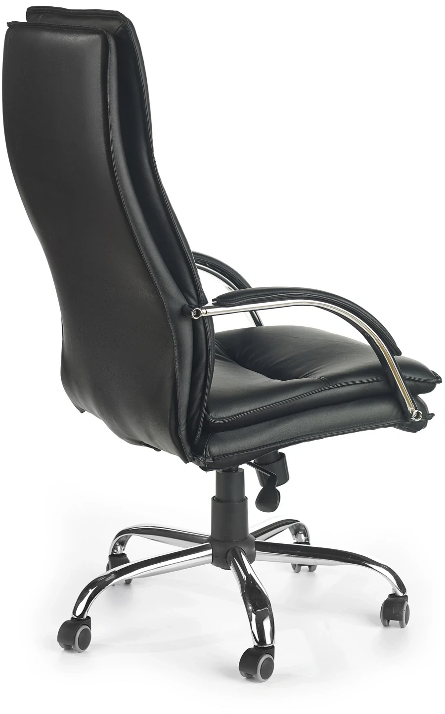 Fotel gabinetowy STANLEY to połączenie stylowego designu z praktycznymi rozwiązaniami, które znacząco podnoszą komfort codziennej pracy. Jego tapicerka z czarnej skóry ekologicznej nadaje mu elegancki wygląd, dzięki czemu doskonale wpisuje się w wystrój nowoczesnych biur, gabinetów oraz domowych miejsc do pracy. Ergonomiczne oparcie oraz szerokie siedzisko zapewniają optymalne podparcie ciała, co pozwala na wielogodzinną pracę bez uczucia zmęczenia. Dzięki mechanizmowi TILT możliwe jest swobodne bujanie się i regulacja wysokości, co umożliwia idealne dopasowanie do indywidualnych preferencji użytkownika. Pięcioramienna podstawa z chromowanego metalu gwarantuje stabilność i wytrzymałość, a kółka powlekane kauczukiem chronią podłogę przed zarysowaniami i umożliwiają ciche przemieszczanie się. STANLEY to fotel, który łączy komfort i reprezentacyjny wygląd z niezawodną funkcjonalnością.
