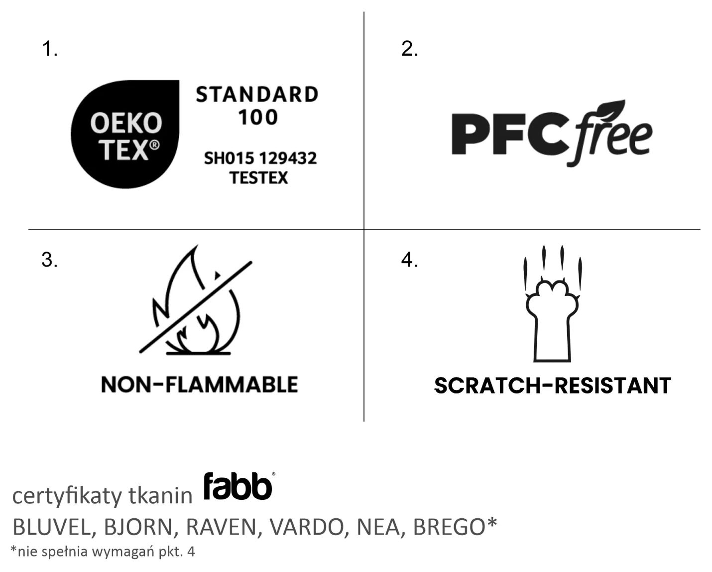 Tkanina Bluvel 14 (szary) - miła w dotyku aksamitna tkanina o modnej kolorystyce. Duża wytrzymałość na tarcie, mechacenie oraz nasłonecznienie. Certyfikaty OEKO-TEX 100 oraz PFC free. Skład PES 100%. Gramatura 320g/m2. Test tarcia Martindale'a >50000 cykli.