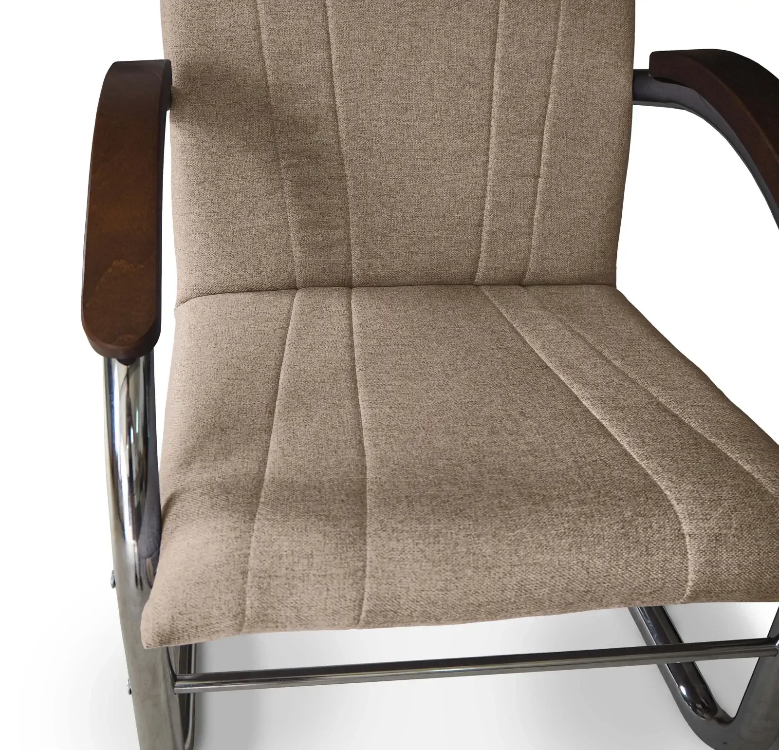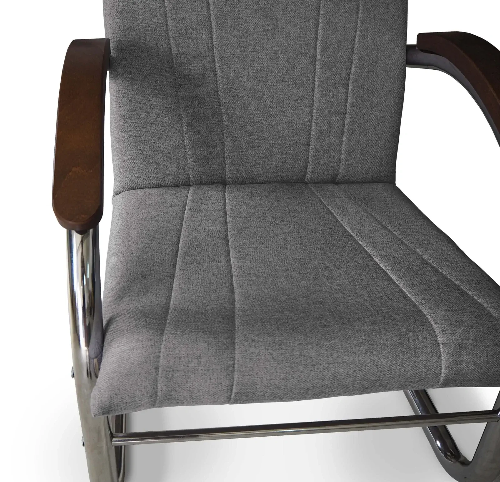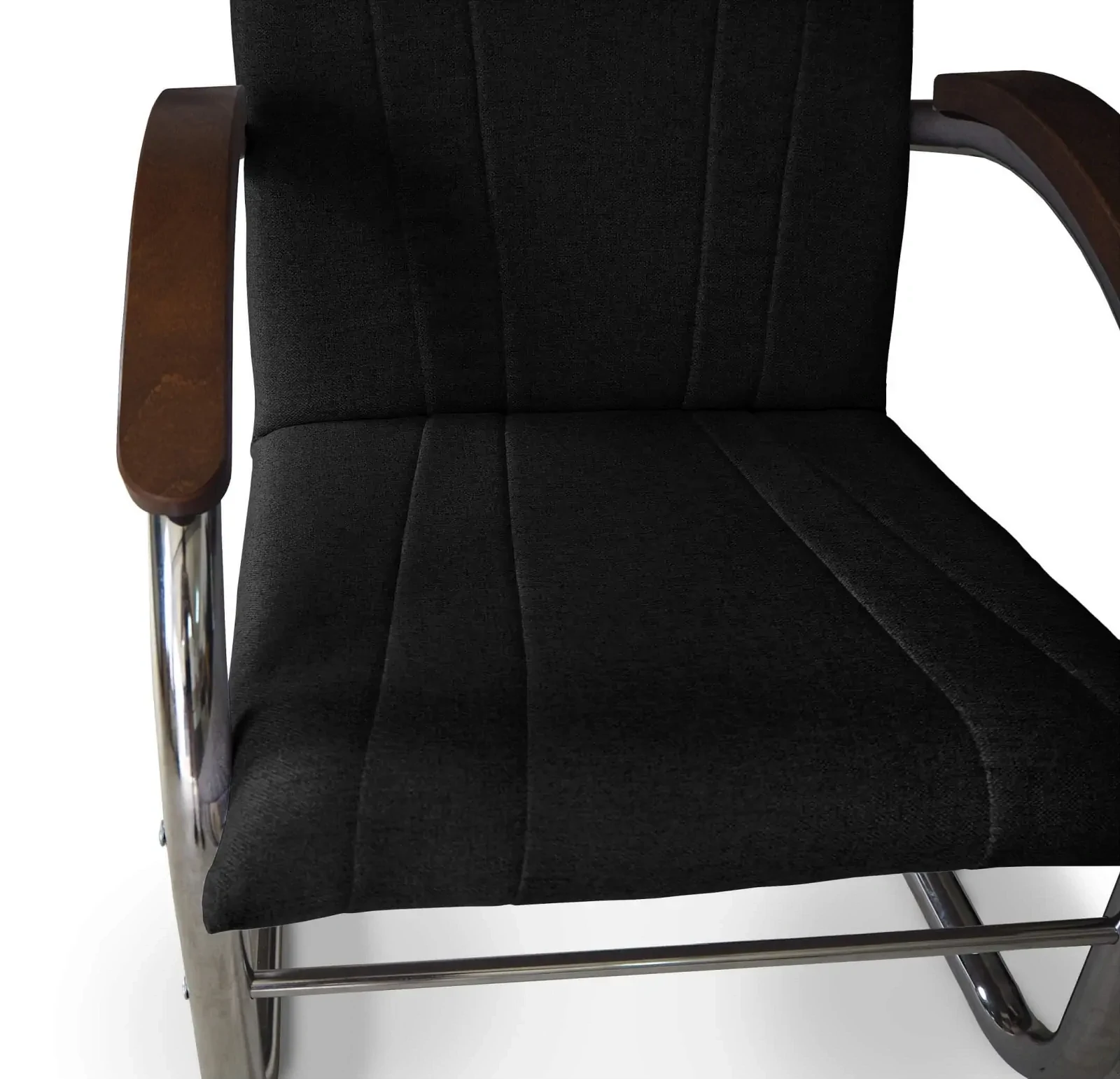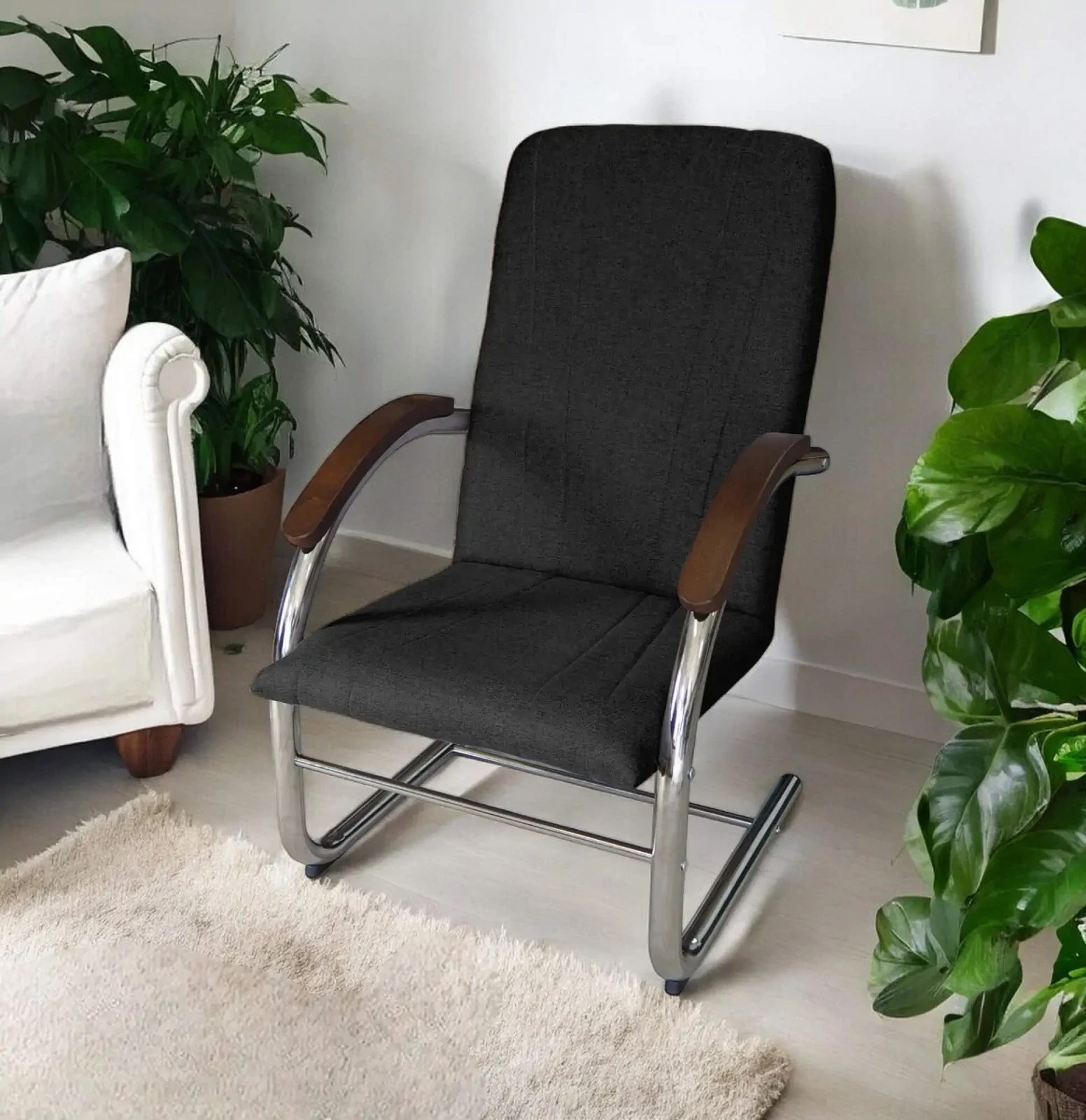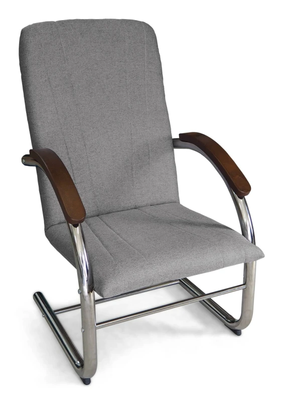 - Stylowy kontrast – Drewniane podłokietniki w ciepłym odcieniu brązu tworzą elegancki kontrast z metalowym stelażem, wprowadzając nutę naturalnego ciepła do nowoczesnych wnętrz.