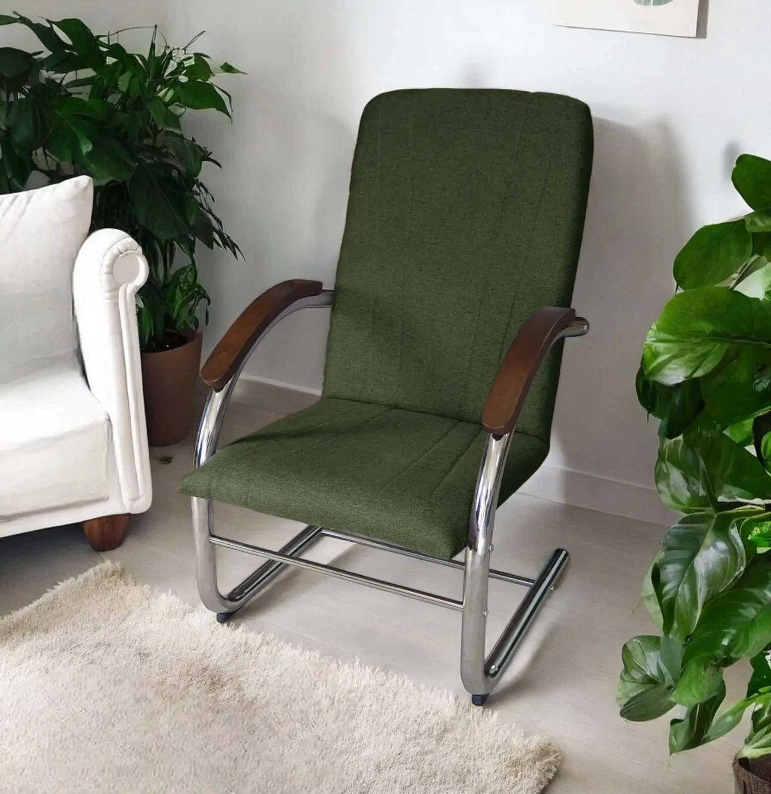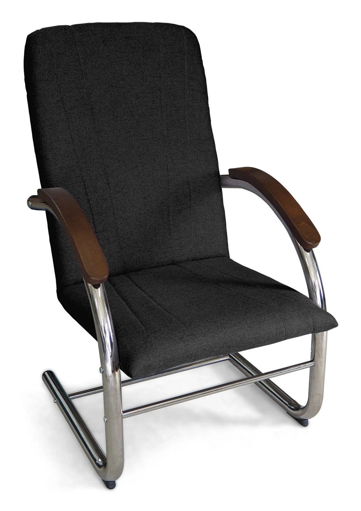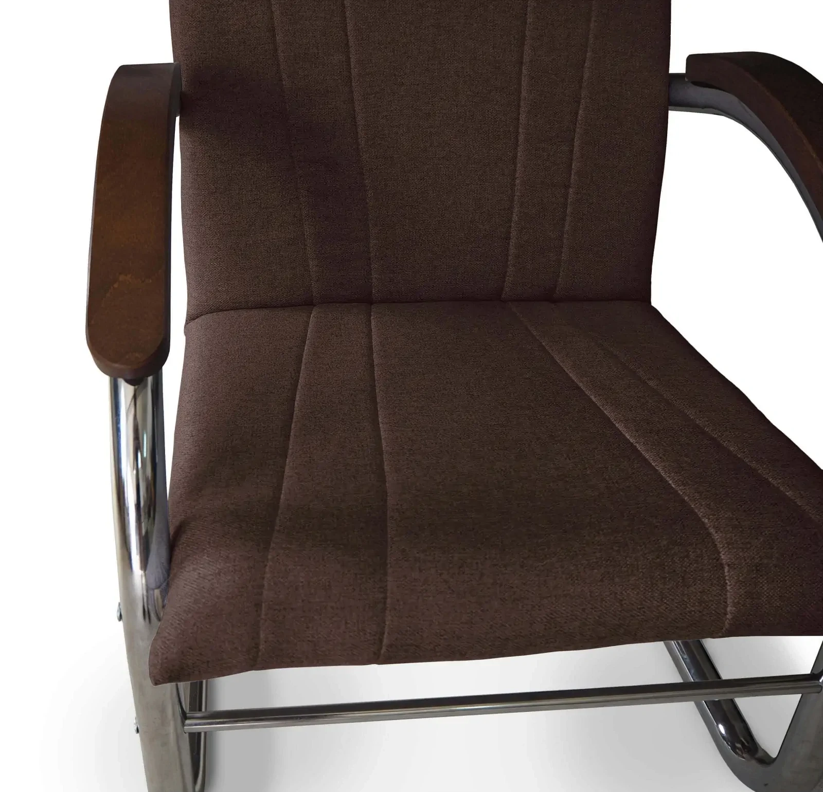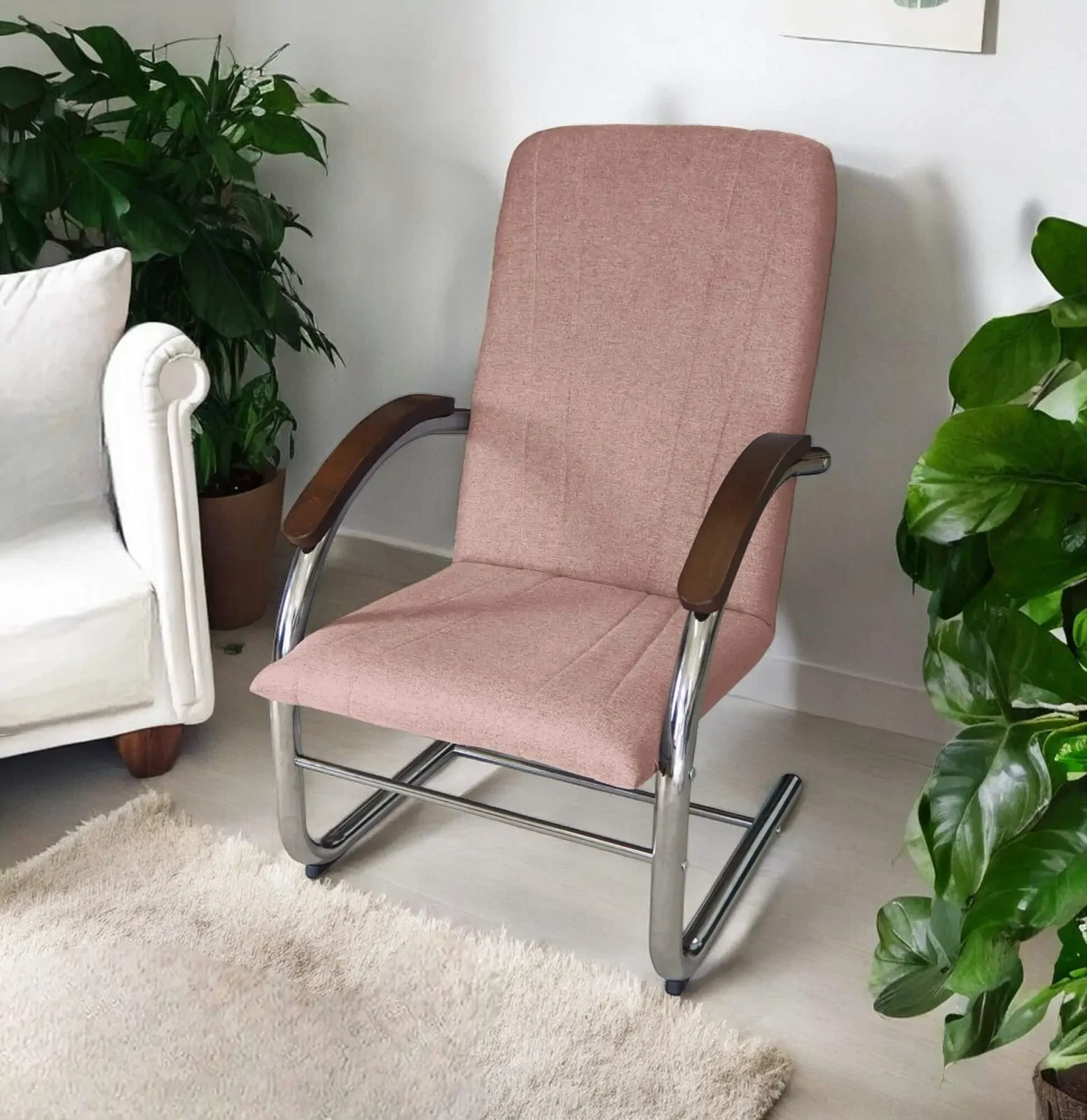 - Stylowy kontrast – Drewniane podłokietniki w ciepłym odcieniu brązu tworzą elegancki kontrast z metalowym stelażem, wprowadzając nutę naturalnego ciepła do nowoczesnych wnętrz.