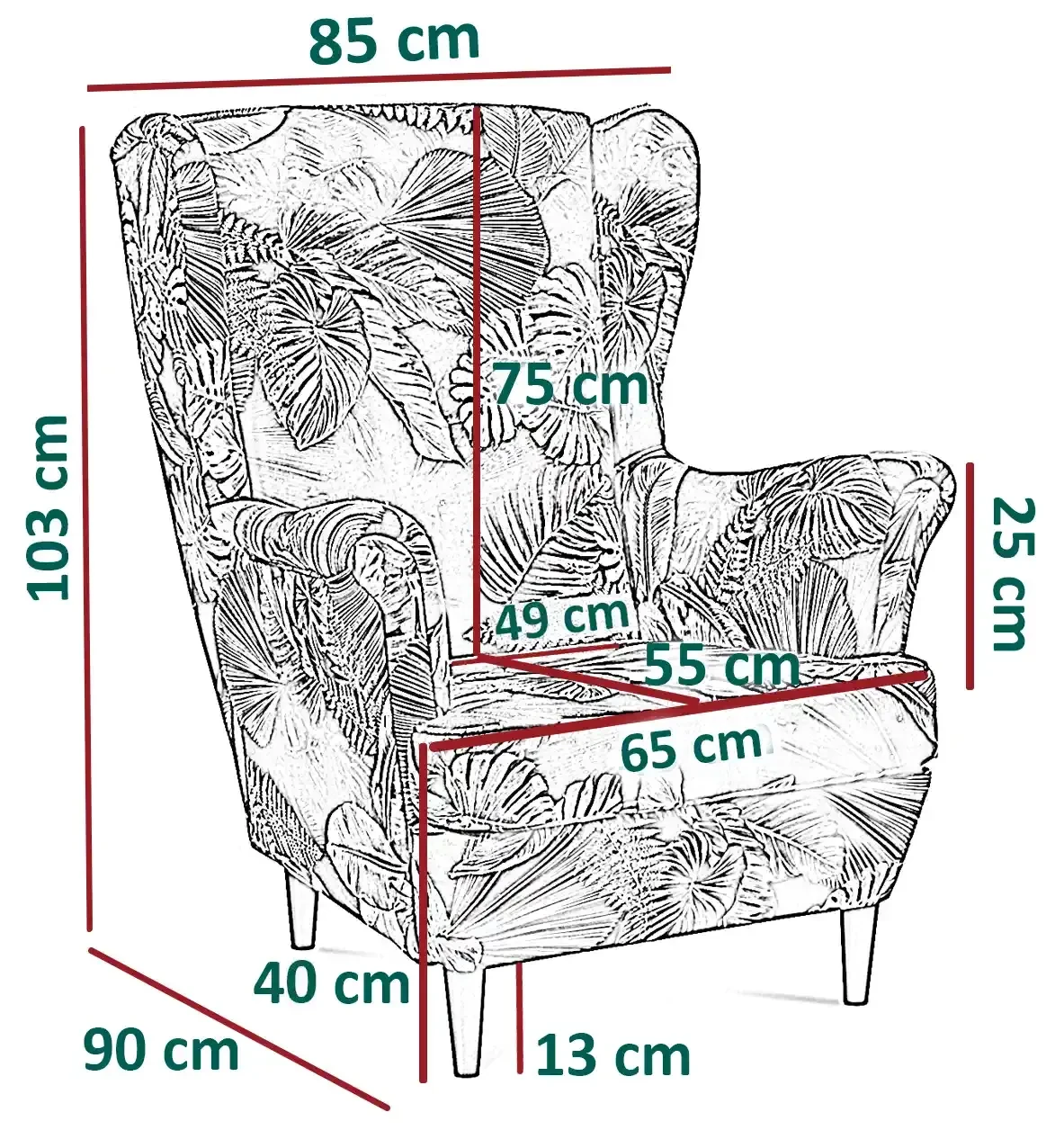 Fotel Lily Kwiaty to pełna wdzięku i estetyki propozycja fotela typu uszak z podłokietnikami, utrzymana jest w stylu skandynawskim. Fotel uszak wykonany został z najlepszych materiałów i dzięki wzorzystym tkaninom do wyboru pozwala dopasować go kolorystycznie do każdego wnętrza. Subtelne aczkolwiek stabilne 13 centymetrowe nóżki (różne kolory do wyboru) dopełniają kompozycję tego mebla. Różne typy przyjemnych w dotyku tkanin zadowolą nawet najbardziej wybredne gusta a ich plamoodporność pomoże w zachowaniu czystości i higieny użytkowania fotela przez lata. Fotel typu Uszak zaprojektowany i wykonany został w Polsce co jest gwarancją jakości - Wspieraj