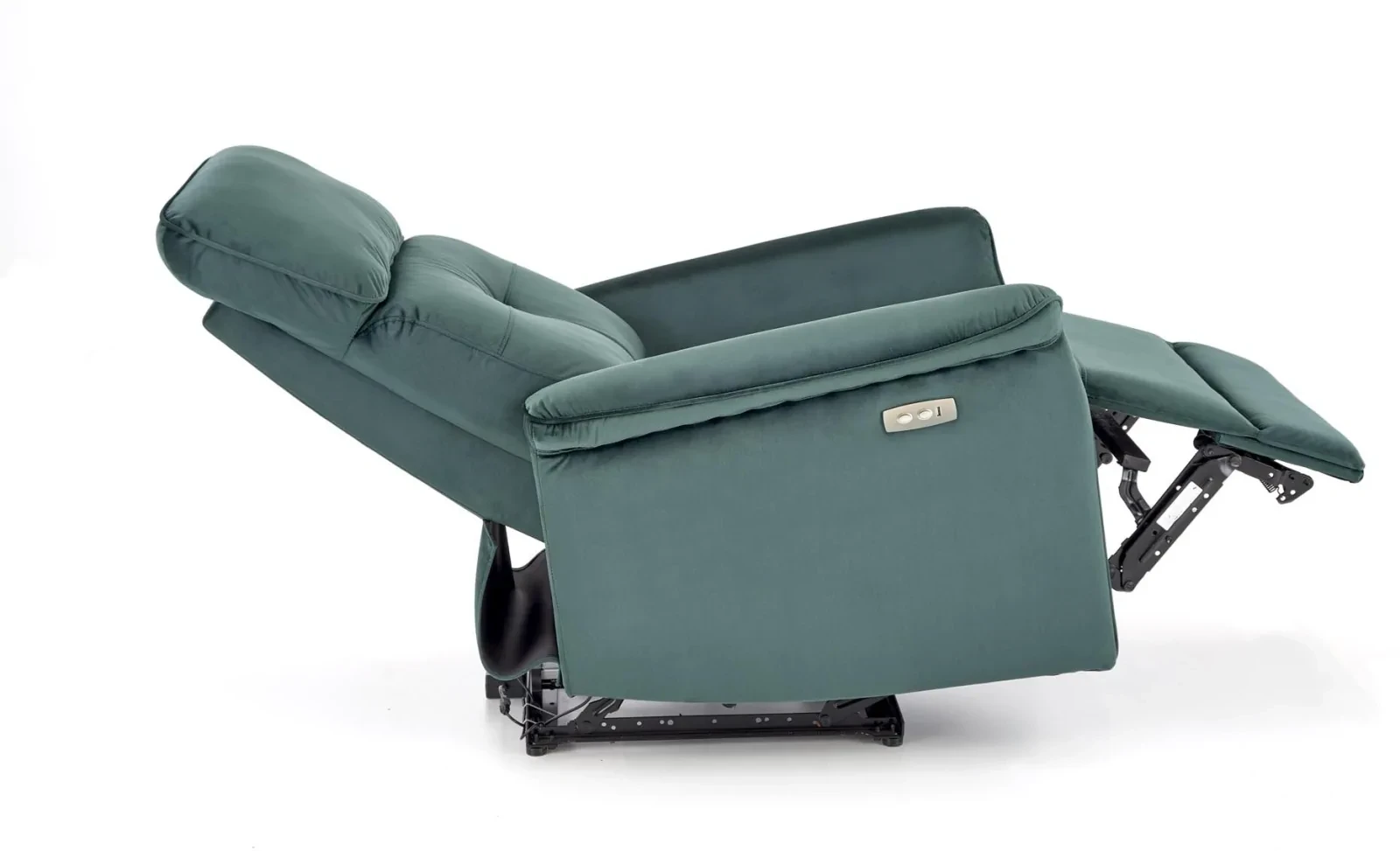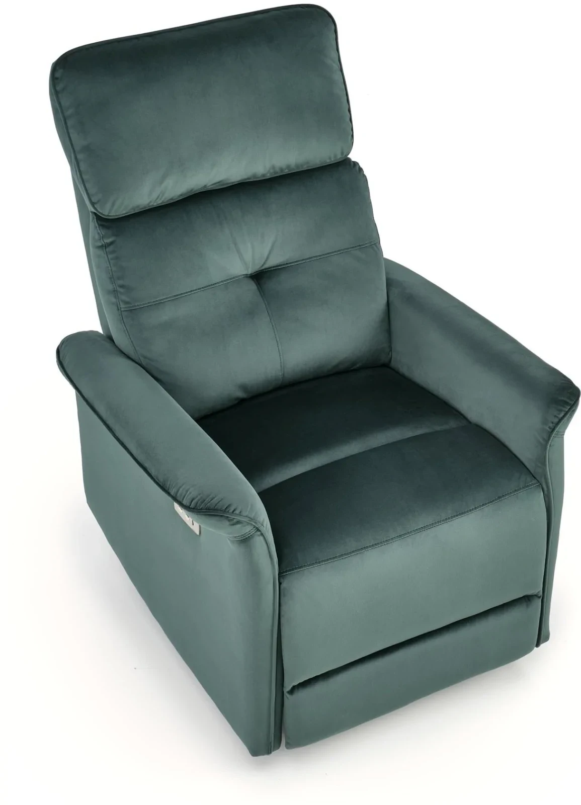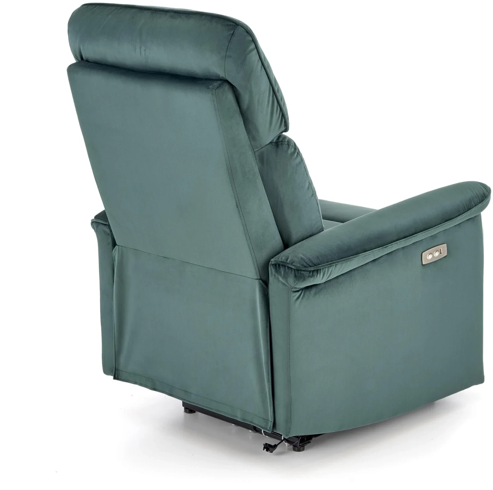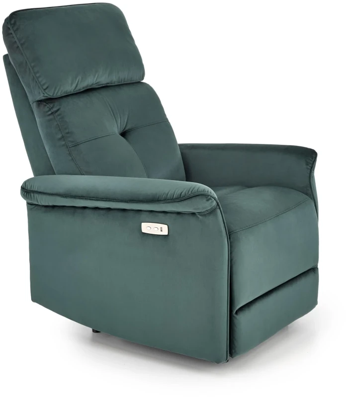 Fotel SEMIR to połączenie klasycznej formy z nowoczesną technologią, zaprojektowany z myślą o maksymalnym komforcie użytkownika. Wyposażony w funkcję elektrycznego rozkładania oraz praktyczne gniazdo USB, stanowi idealne miejsce do relaksu i codziennego wypoczynku. Wykonany z miękkiej, aksamitnej tkaniny velvet w głębokim odcieniu ciemnej zieleni, wnosi do wnętrza elegancję i przytulny klimat.