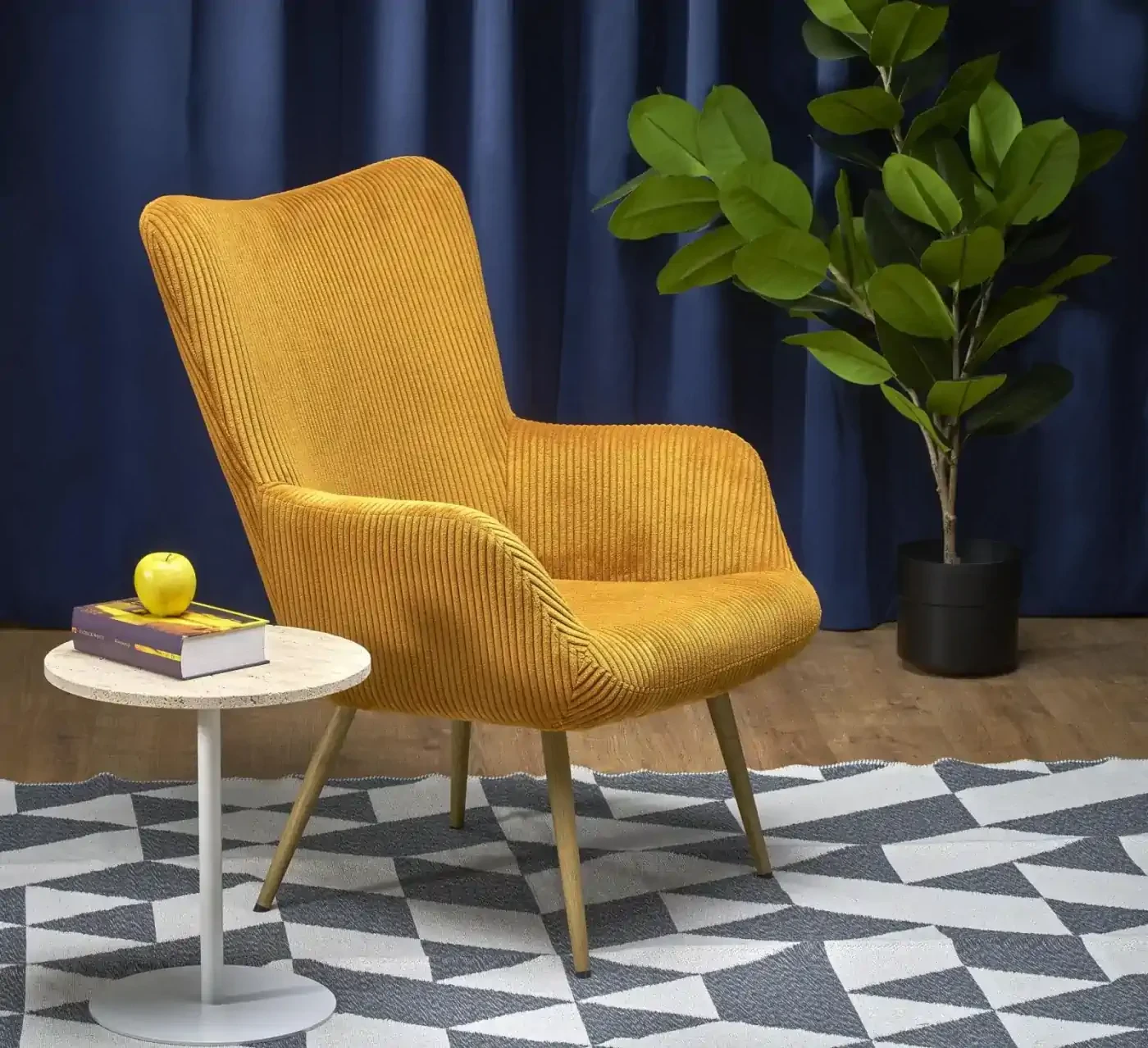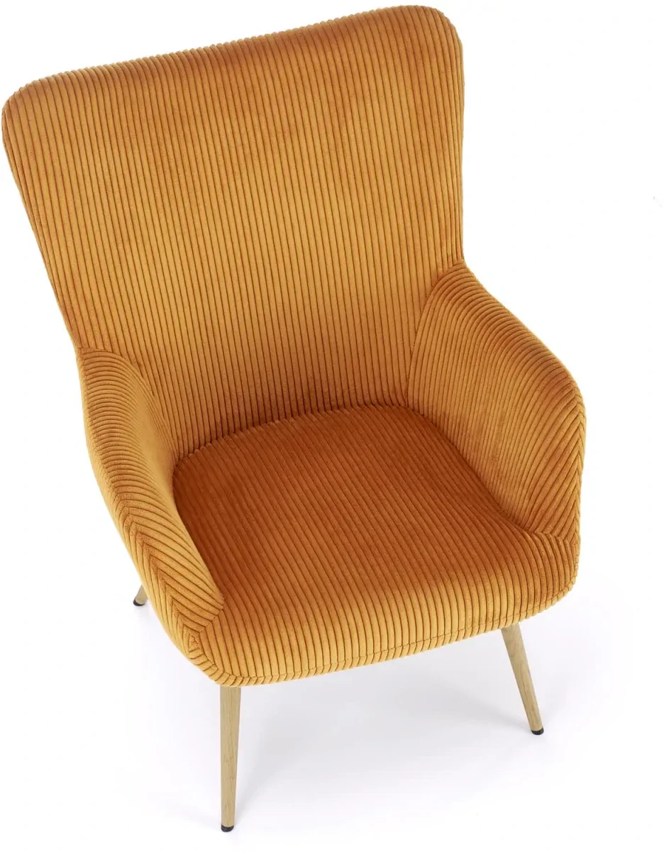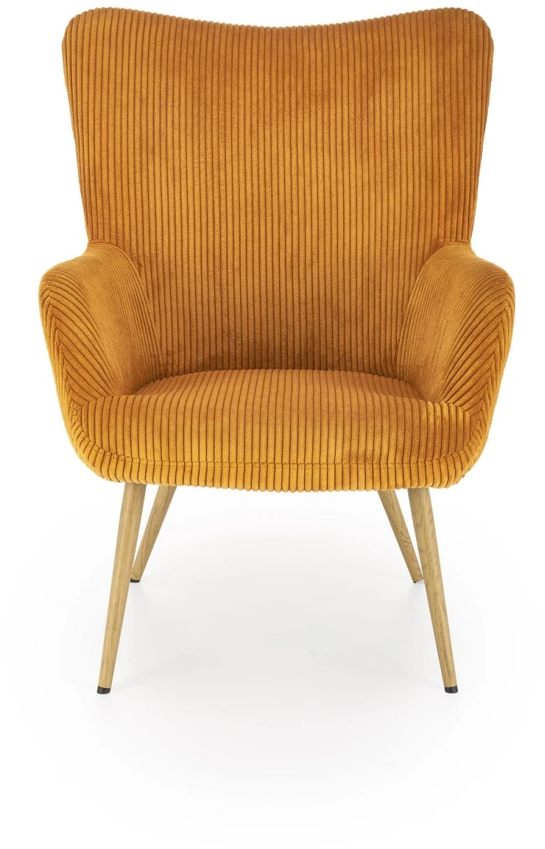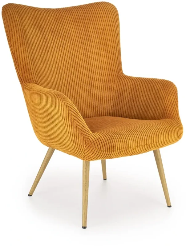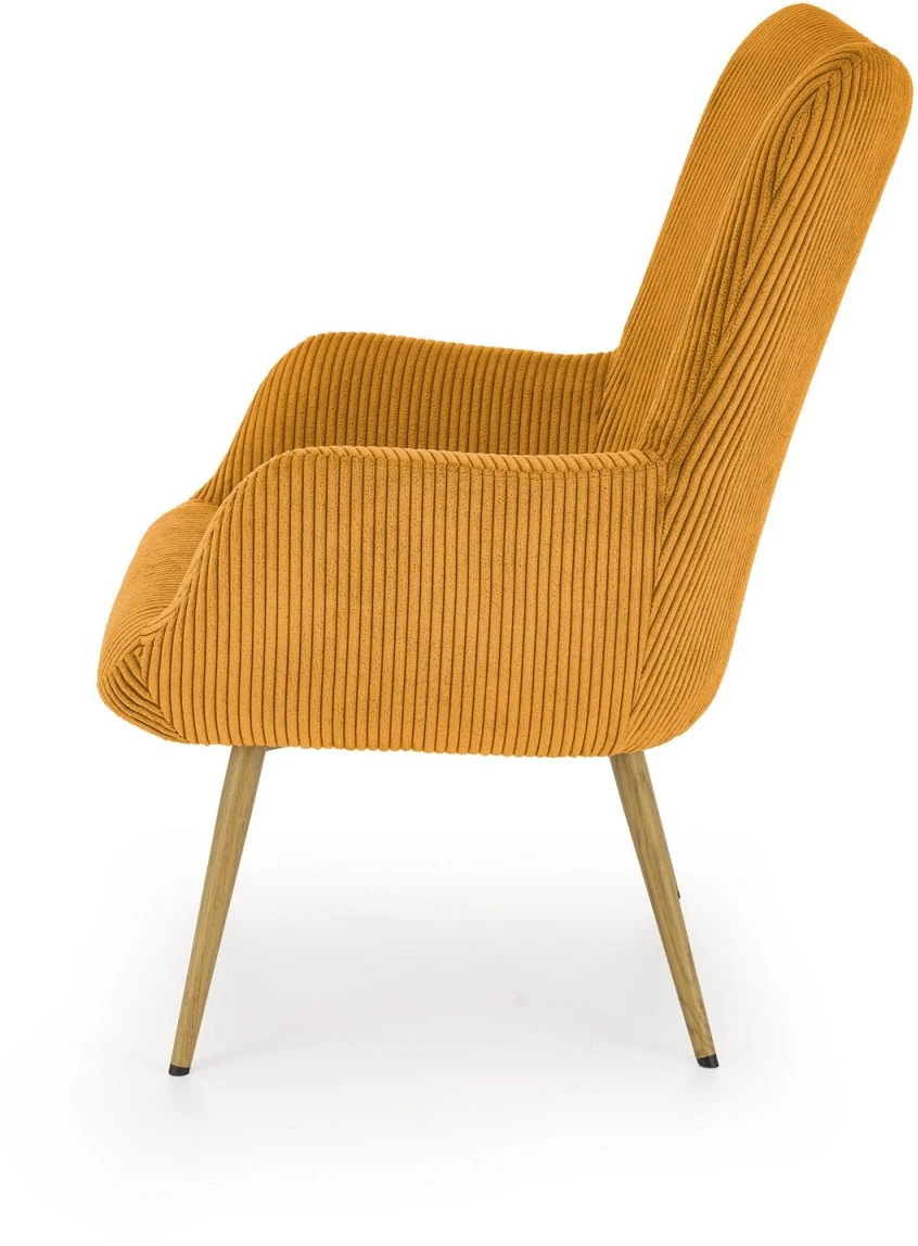 - Elegancki design – nowoczesna forma fotela, podkreślona tkaniną sztruksową w musztardowym kolorze, doskonale komponuje się z różnorodnymi aranżacjami wnętrz.