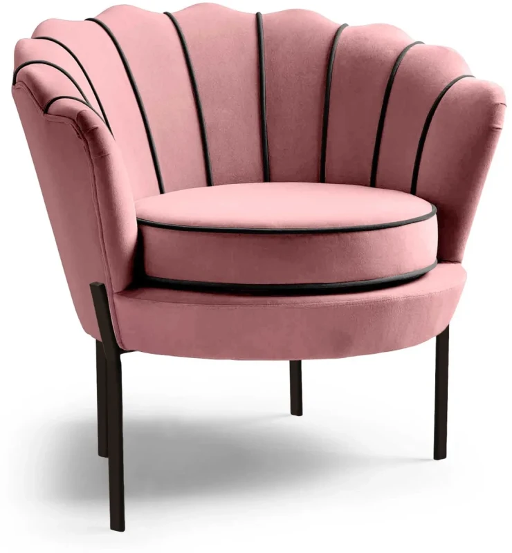 Fotel ANGELO w kolorze pudrowego różu to wyrafinowane połączenie estetyki glamour z nowoczesnym podejściem do designu. Jego charakterystyczne, zaokrąglone oparcie w kształcie muszli natychmiast przyciąga uwagę i nadaje wnętrzu przytulnego, a zarazem luksusowego klimatu. Miękka i aksamitna tkanina velvet BLUVEL w odcieniu różowym nie tylko cieszy oko, ale także zapewnia wyjątkową wygodę podczas wypoczynku. Dzięki zwartej bryle oraz delikatnie zarysowanej linii siedziska, fotel doskonale odnajduje się zarówno w salonie, sypialni, jak i eleganckim gabinecie. Czarne, metalowe nogi nadają całości lekkości i stabilności, podkreślając jednocześnie nowoczesny charakter mebla. To idealny wybór dla osób, które cenią sobie komfort, estetykę i niepowtarzalny styl.