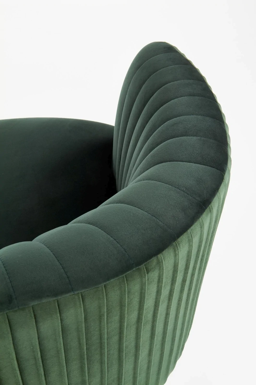 Fotel CROWN to kwintesencja stylu glamour i elegancji, która doda luksusowego charakteru każdemu wnętrzu. Tapicerowany miękką, aksamitną tkaniną velvet w odcieniu ciemnej zieleni, zachwyca subtelnym połyskiem i przyjemną w dotyku fakturą. Smukłe, złote nogi z chromowanego metalu nadają mu lekkości i nowoczesnego wyrazu, tworząc wyjątkowe połączenie komfortu z wysmakowanym designem. Doskonale sprawdzi się w salonie, sypialni lub gabinecie jako stylowy akcent wypoczynkowy.