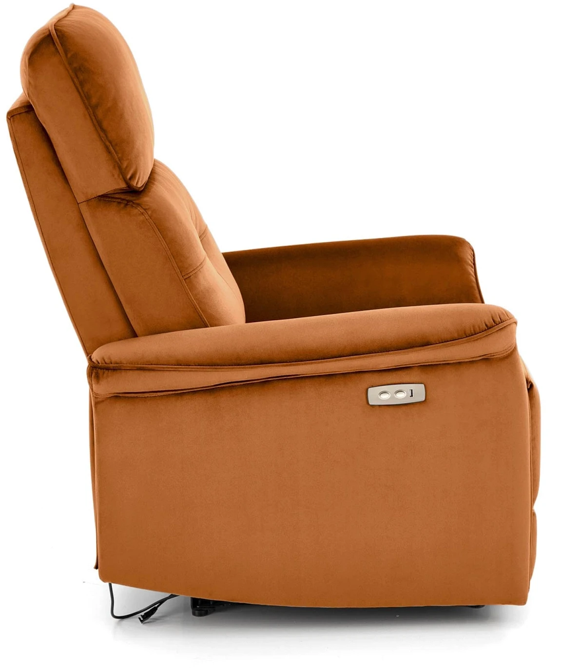 Fotel wypoczynkowy Semir to esencja komfortu i nowoczesności, idealnie wpasowująca się w każde wnętrze. Zaprojektowany z myślą o maksymalnej wygodzie użytkownika, oferuje funkcję elektrycznego rozkładania, która umożliwia dostosowanie pozycji siedzenia do indywidualnych potrzeb za pomocą jednego przycisku. Wbudowane gniazdo USB dodaje funkcjonalności, umożliwiając ładowanie urządzeń mobilnych bez potrzeby wstawania. Materiał obicia wykonany z tkaniny typu velvet w kolorze cynamonowym (BLUVEL 4215) nie tylko dodaje elegancji, ale również zapewnia trwałość i łatwość w utrzymaniu czystości. Podsumowując, fotel wypoczynkowy Semir to idealne rozwiązanie dla tych, którzy cenią sobie nowoczesny design, funkcjonalność i maksymalny komfort. Dzięki innowacyjnym funkcjom, takim jak elektryczne rozkładanie i wbudowane gniazdo USB, fotel ten staje się nie tylko meblem, ale i centrum codziennego relaksu i komfortu. Jego elegancki wygląd i praktyczne rozwiązania sprawiają, że doskonale komponuje się z różnymi stylami wnętrz, dodając im klasy i przytulnego charakteru.