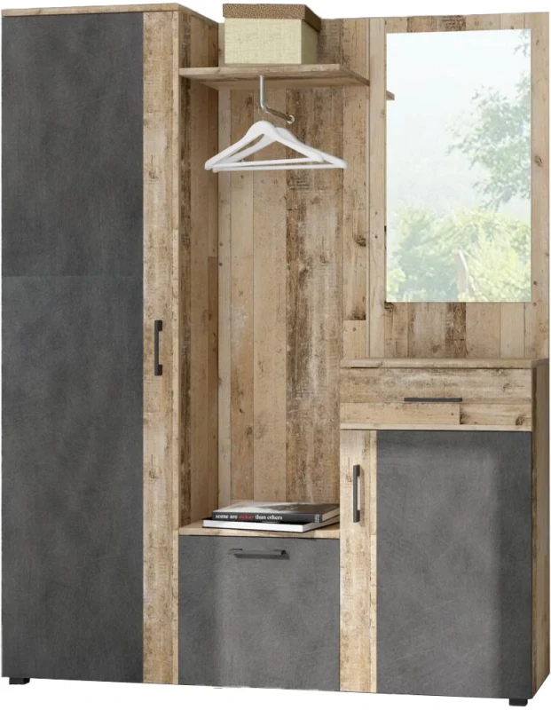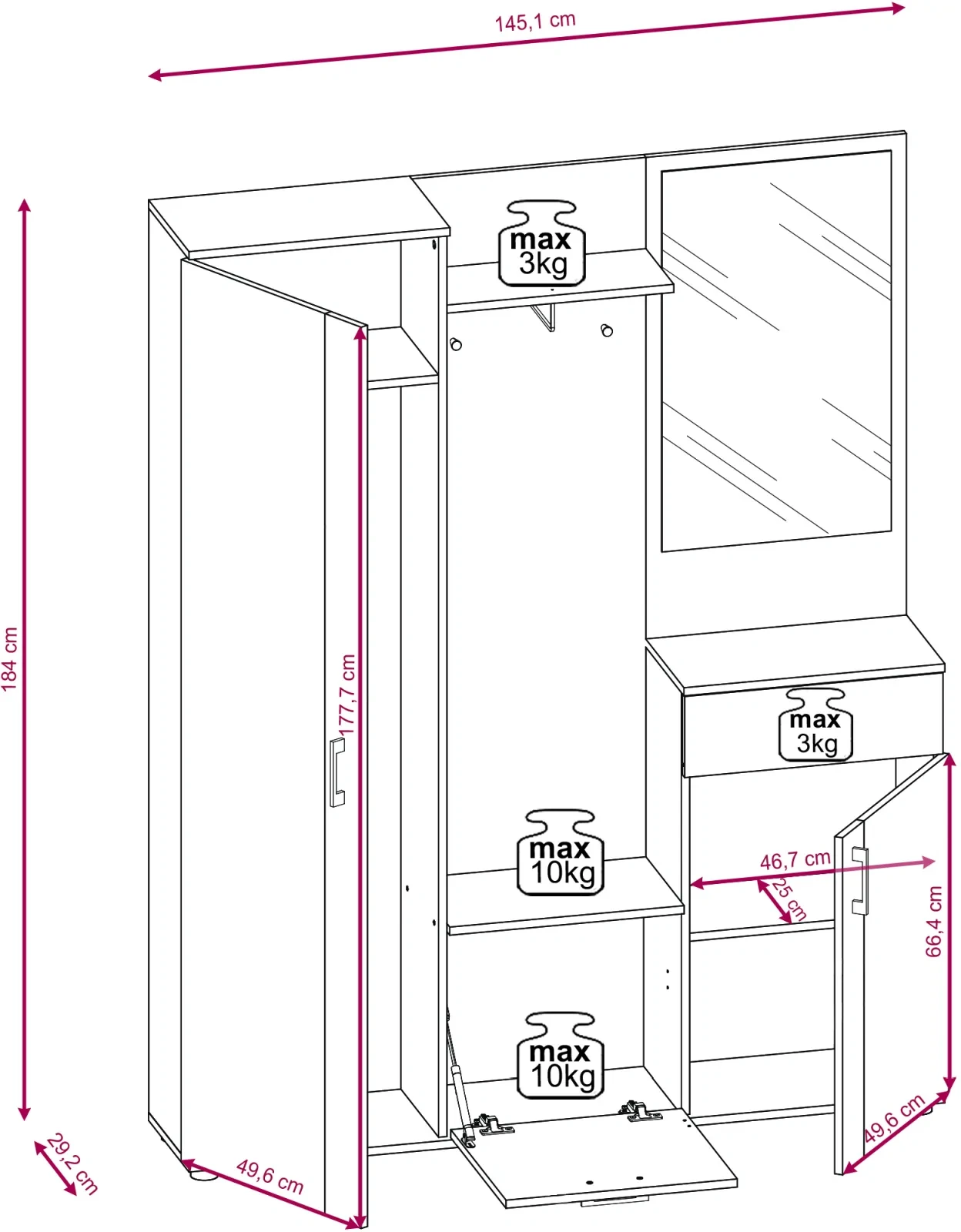 - Przestronność i funkcjonalność: garderoba wyposażona w liczne półki, szufladę oraz wieszak, umożliwia wygodne przechowywanie ubrań, butów i akcesoriów, zapewniając ład i porządek w przedpokoju.