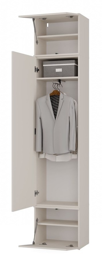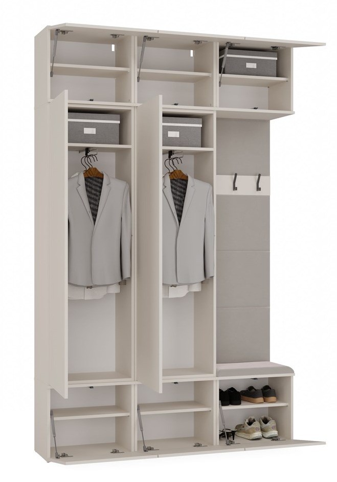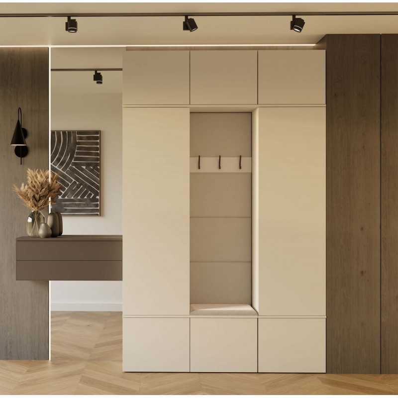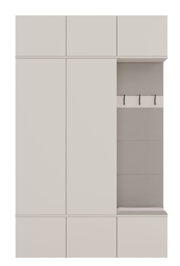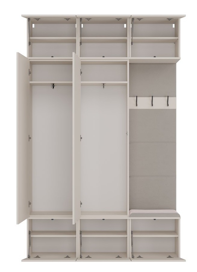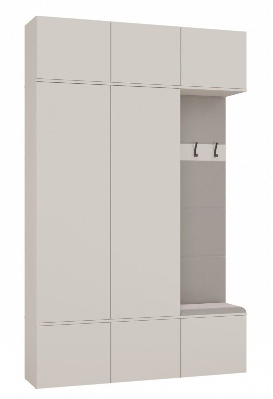 Garderoba HAGA III to stylowe i praktyczne rozwiązanie do przedpokoju, które łączy w sobie elegancję i dużą przestrzeń do przechowywania. Modułowe połączenie dwóch szaf i jednego wieszaka zapewnia miejsce na odzież wiszącą oraz dodatkową organizację ubrań. Wytworny odcień kaszmir beż z matowym wykończeniem sprawia, że garderoba harmonijnie wpisze się zarówno w nowoczesne, jak i klasyczne aranżacje.