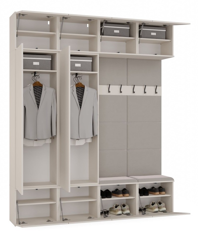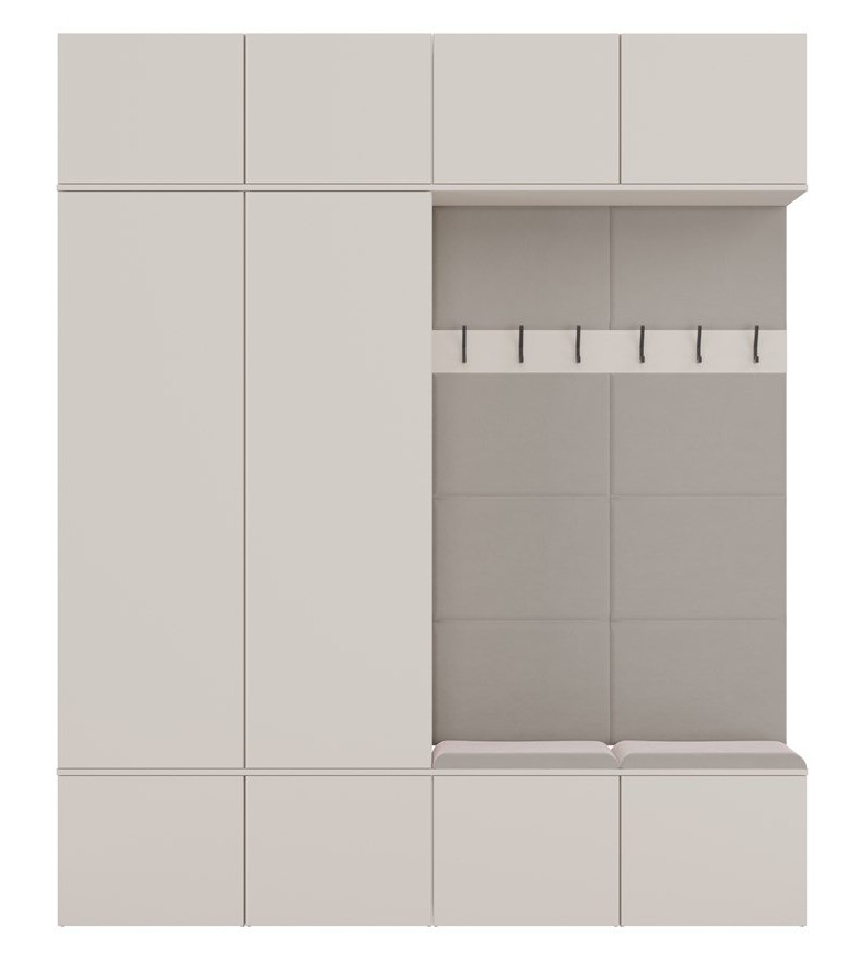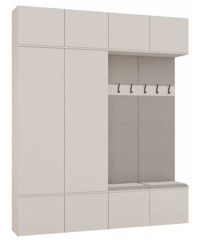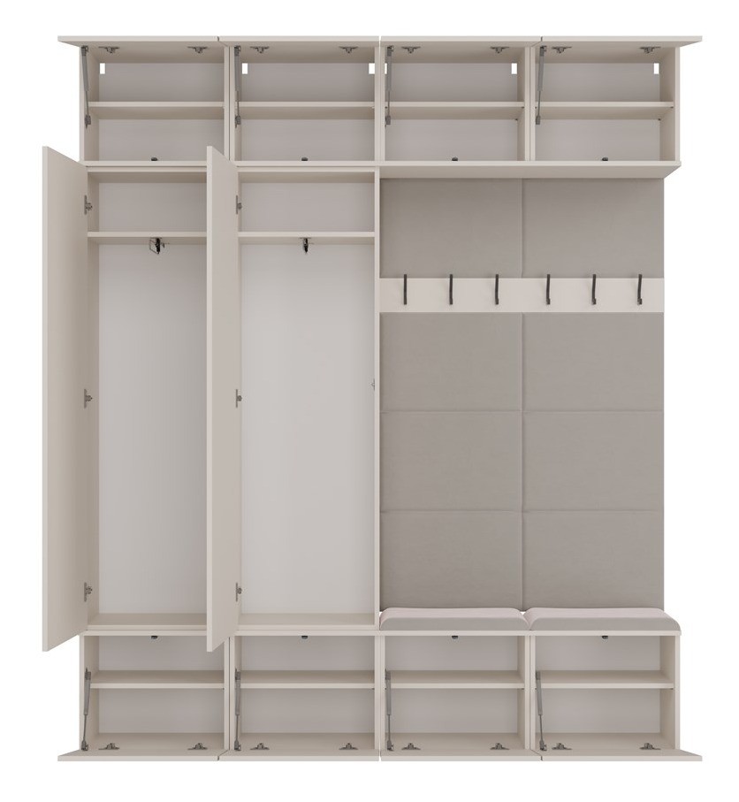Garderoba HAGA IV to elegancki i funkcjonalny zestaw modułowy do przedpokoju. Połączenie dwóch pojemnych szaf oraz dwóch wieszaków tworzy imponującą przestrzeń przeznaczoną na odzież wierzchnią, akcesoria i obuwie. Delikatny, neutralny odcień kaszmir beż wprowadza do wnętrza ciepło i harmonijny charakter, idealnie wpisując się w nowoczesne i klasyczne aranżacje.