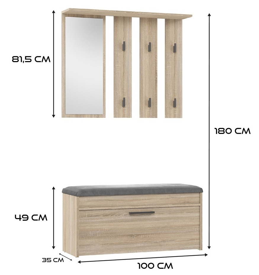 Garderoba Parma Dąb Sonoma to połączenie funkcjonalności i skandynawskiej estetyki, które doskonale sprawdzi się w przedpokoju. Zestaw zawiera wieszak z lustrem oraz szafkę na buty z wygodnym siedziskiem i schowkiem. Lekka forma w połączeniu z ciepłym dekorze dębu Sonoma sprawia, że mebel wprowadza przytulność i harmonię do wnętrza, jednocześnie zachowując nowoczesny charakter.