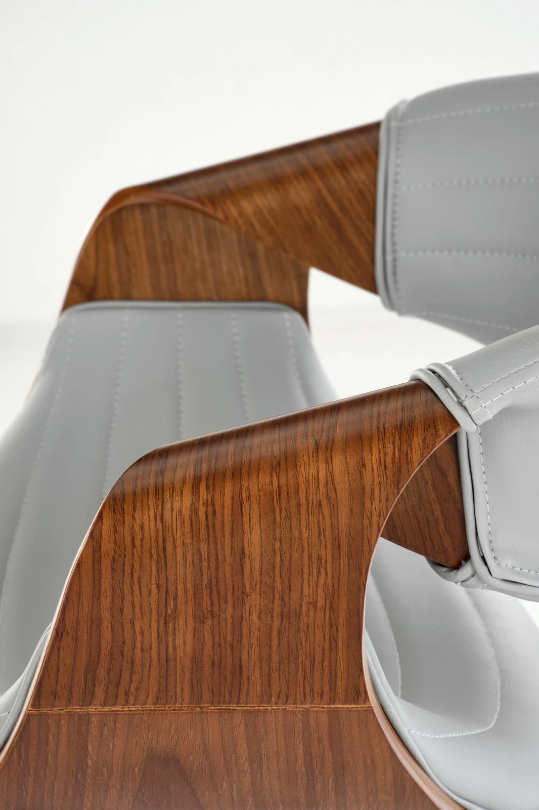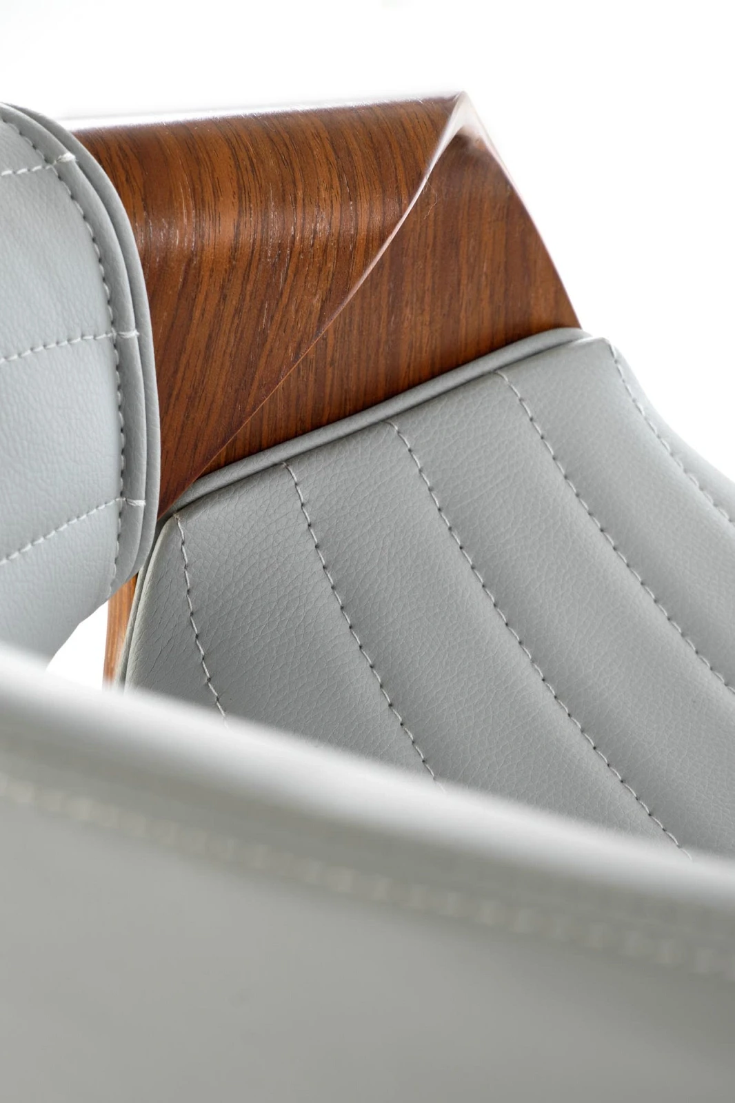 Hoker H123 to nowoczesne połączenie elegancji i funkcjonalności, które wprowadzi wyjątkowy charakter do każdej kuchni, jadalni czy przestrzeni barowej. Jego niebanalna forma, inspirowana stylem retro z nutą współczesnego minimalizmu, przyciąga wzrok i podkreśla dbałość o detale. Profilowane siedzisko oraz ergonomicznie wygięte oparcie wykonane z miękkiej ekoskóry zapewniają nie tylko wygodę, ale też stylową estetykę. Całość osadzona została na stabilnej, giętej ramie ze sklejki w odcieniu orzecha, co dodaje ciepła i naturalnego wyrazu. Chromowany podnóżek nie tylko podnosi komfort użytkowania, ale również wprowadza subtelny, nowoczesny akcent. Model H123 to doskonały wybór dla osób, które cenią wysoką jakość wykonania, komfort i ponadczasowy design.