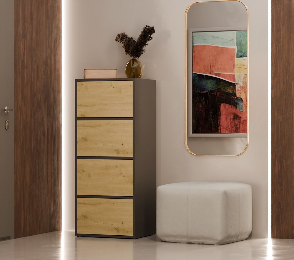 Komoda ALMA to połączenie elegancji i funkcjonalności. Nowoczesna forma w wyrafinowanym połączeniu antracytu i dębu artisan wnosi przytulny, a zarazem stylowy akcent do wnętrz. Cztery bezuchwytowe fronty otwierane systemem TIP‑ON podkreślają minimalistyczny design, zaś solidna konstrukcja zapewnia trwałość. Idealna do salonu, sypialni, przedpokoju czy biura — sprawdzi się wszędzie tam, gdzie cenimy porządek i gustowną estetykę.