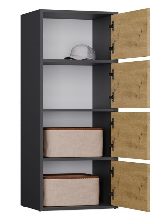 - Cztery drzwi z 4 półkami wewnętrznymi – maksymalizują przestrzeń do przechowywania, gwarantując porządek i praktyczne wykorzystanie wnętrza.
