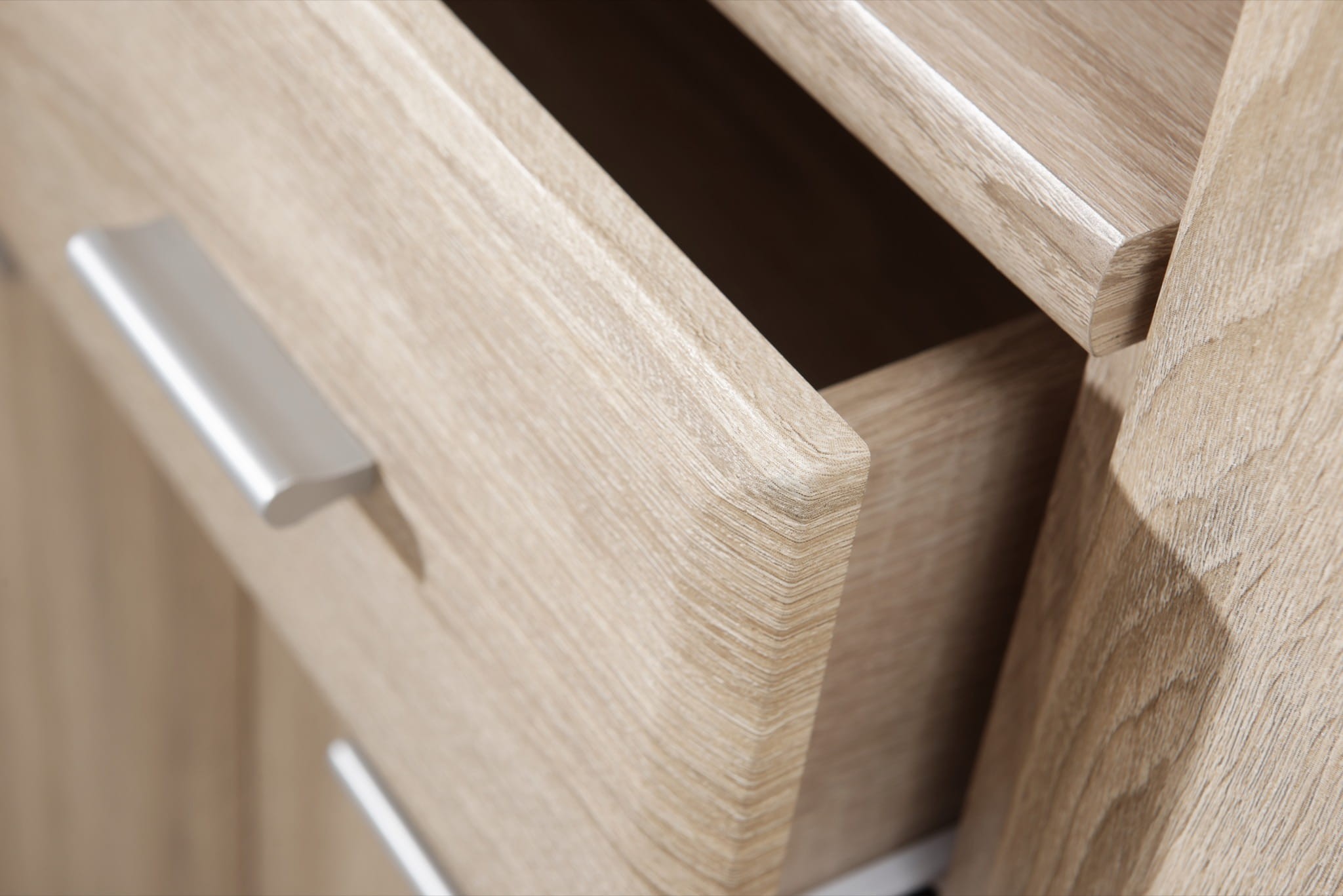 - Wytrzymałość i trwałość: Wykonana z wysokiej jakości materiałów, takich jak laminowana płyta meblowa oraz fronty z MDF pokryte folią PVC, komoda gwarantuje długowieczność i odporność na uszkodzenia. Matowe wykończenie frontów nadaje jej elegancki wygląd, jednocześnie minimalizując widoczność ewentualnych zabrudzeń i zarysowań.