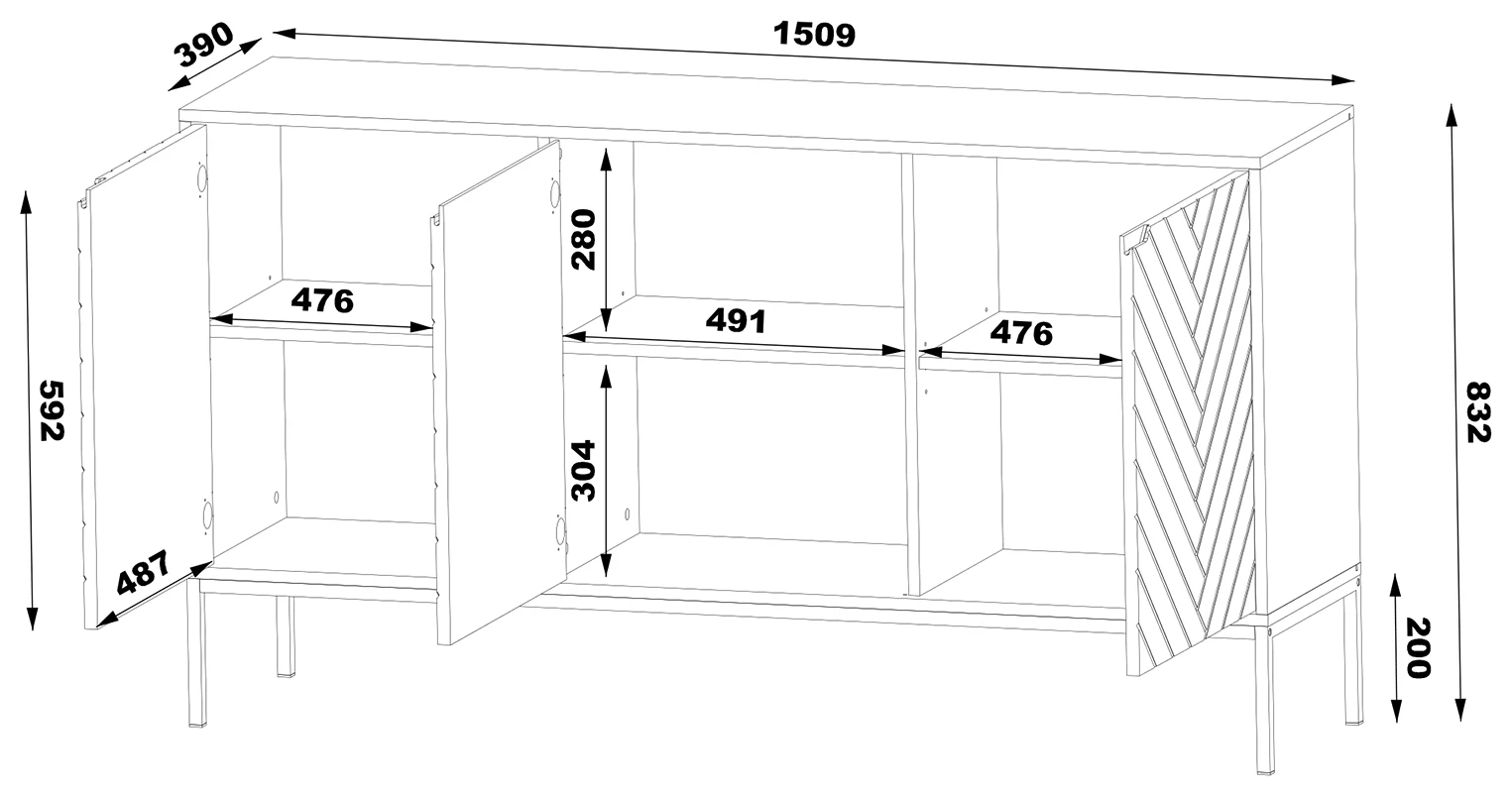 - Unikalny design z frezowanymi frontami: Eleganckie wzory frezowań na frontach sprawiają, że komoda staje się głównym elementem dekoracyjnym w salonie, jednocześnie zachowując minimalistyczny wygląd.