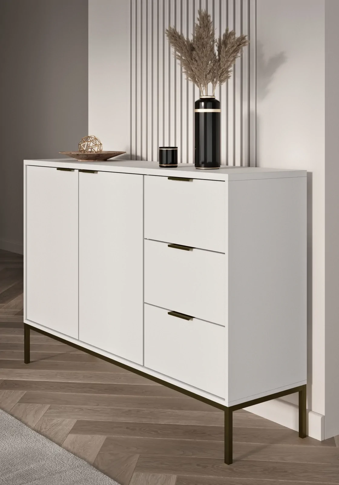 Komoda Austin w klasycznej kolorystyce białej z czarnymi akcentami to wyjątkowe połączenie minimalistycznej elegancji i funkcjonalności, które doskonale sprawdzi się w nowoczesnych wnętrzach. Dzięki szerokości 150 cm komoda zapewnia dużą przestrzeń do przechowywania, jednocześnie pozostając kompaktowym i stylowym dodatkiem do salonu czy sypialni. Białe, matowe fronty połączone z czarnymi uchwytami i stelażem tworzą wyrazisty kontrast, który nadaje meblowi współczesny charakter. To idealna propozycja dla osób, które cenią sobie elegancki design w połączeniu z praktycznymi rozwiązaniami.