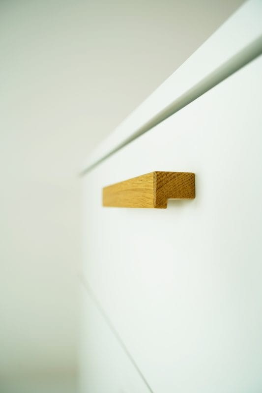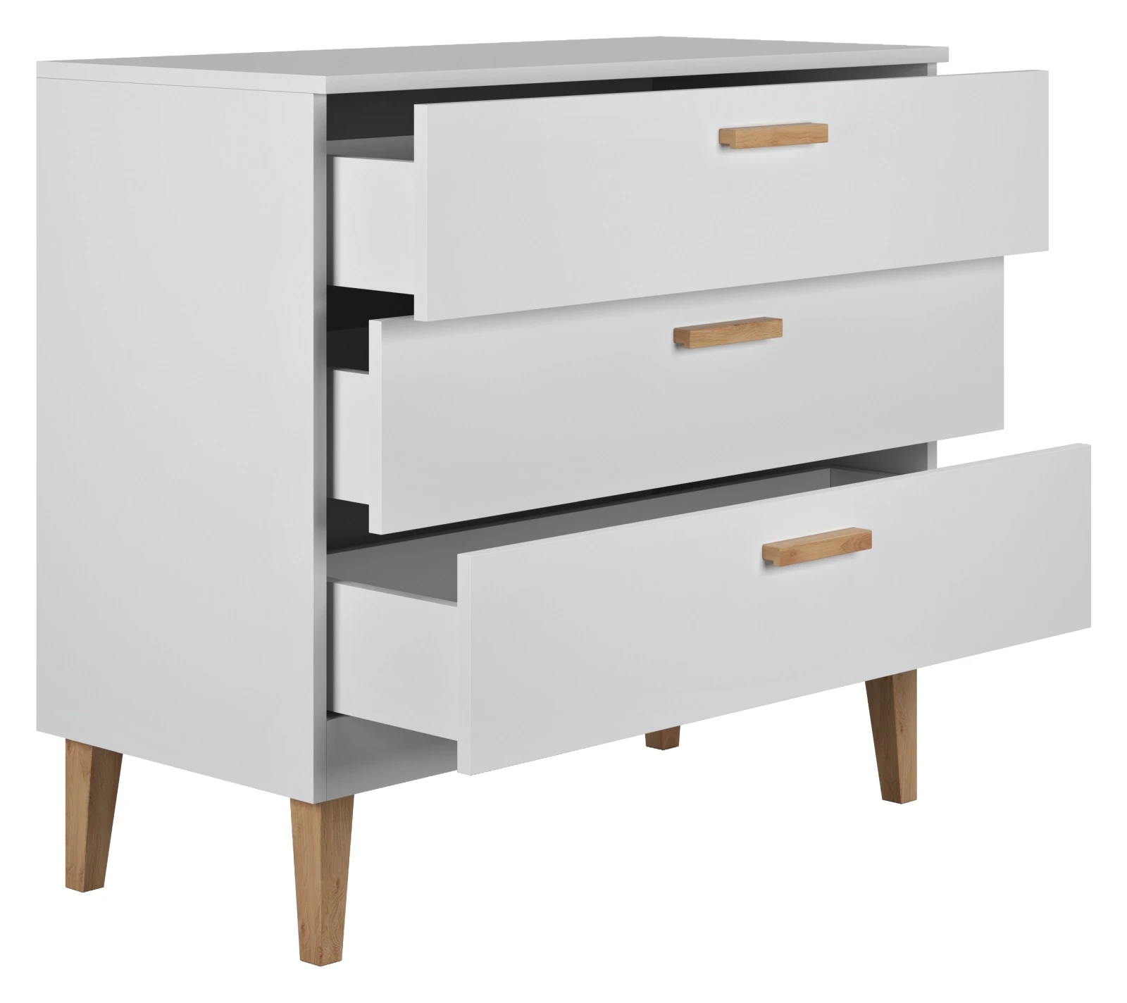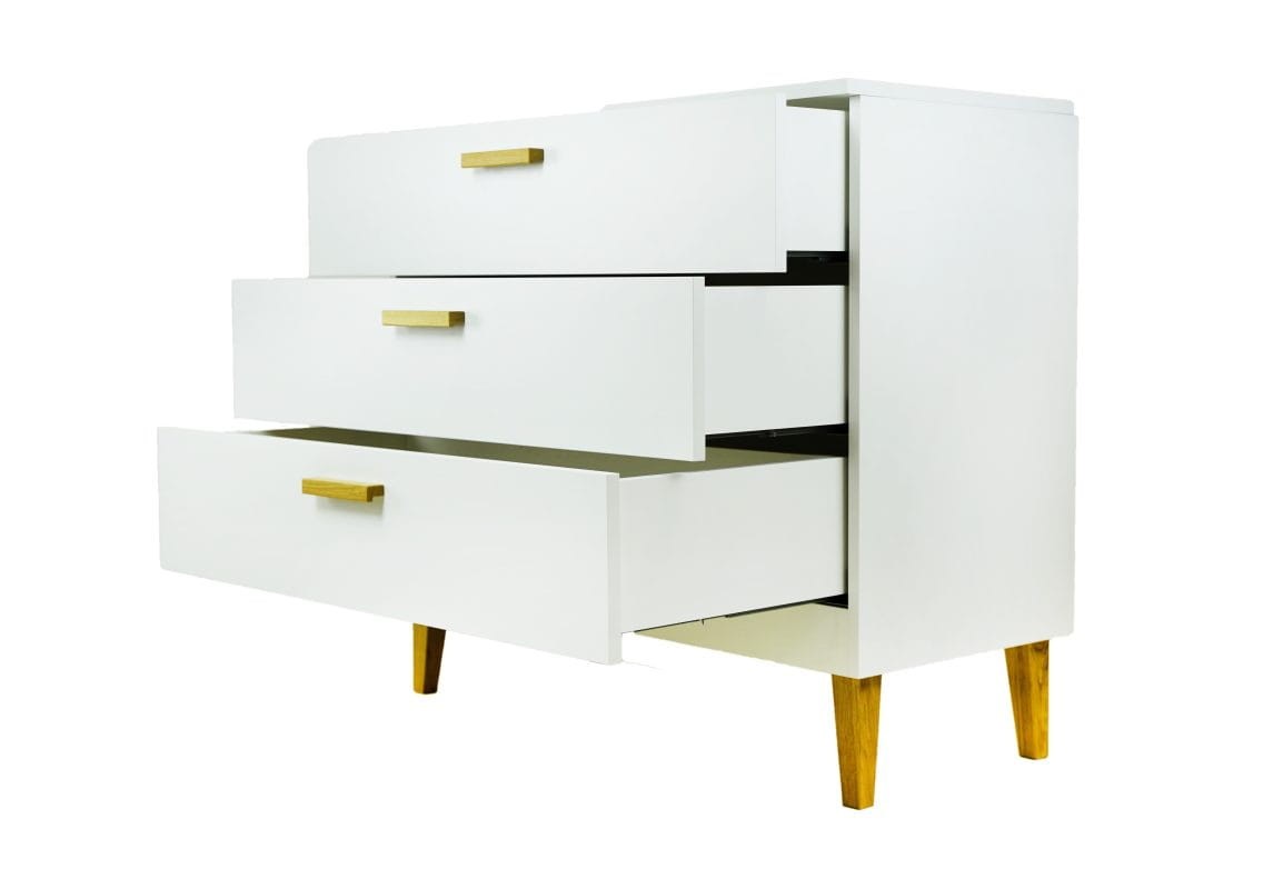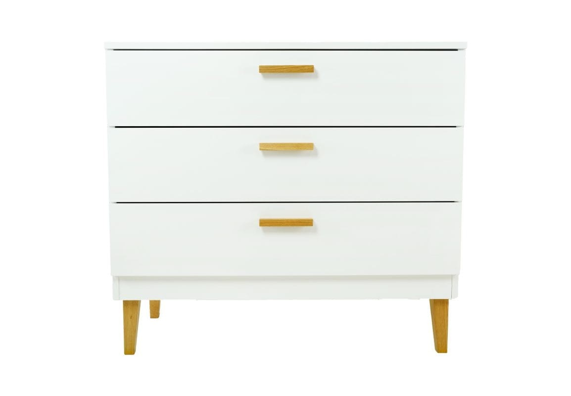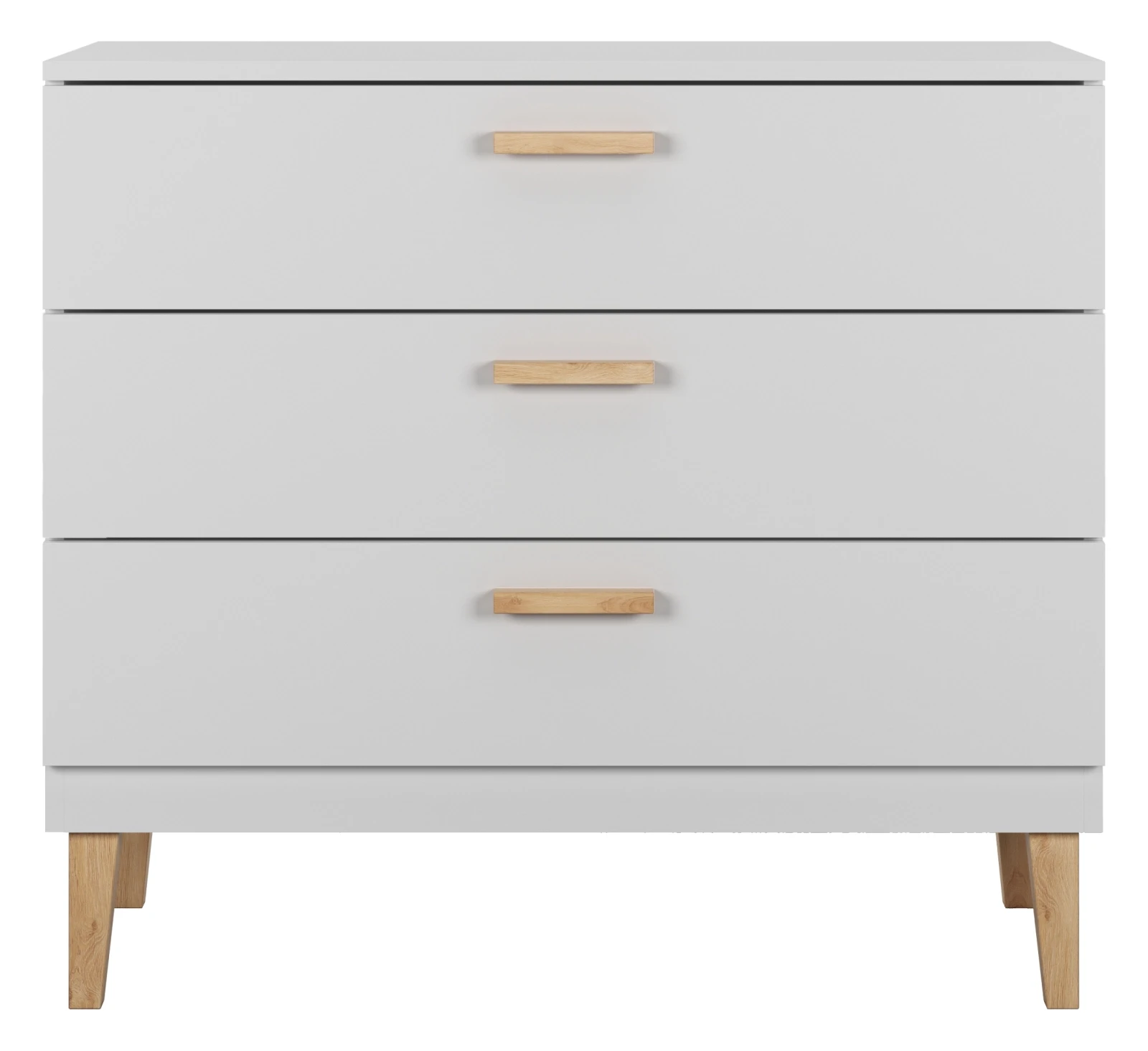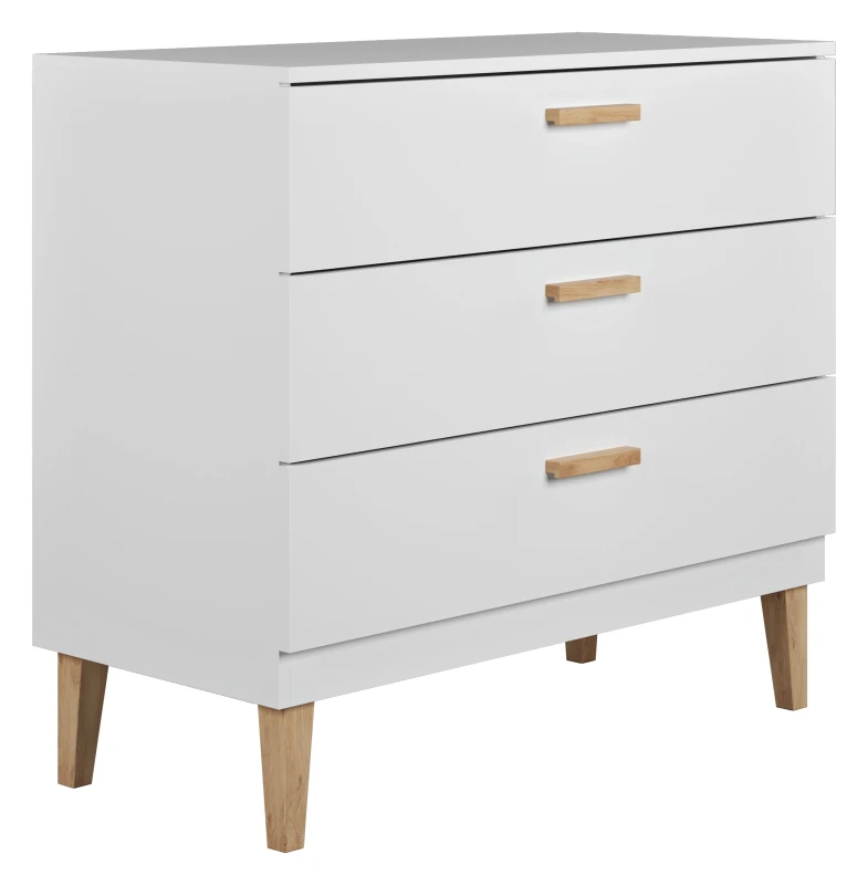 Komoda Kubi to nowoczesna propozycja praktycznej komody do sypialni z serii mebli do pokoju dziecięcego KUBI. Komoda wykonana została z wysokiej jakości matowej płyty MDF o grubości 18 mm. Nogi, tak jak i ergonomiczne uchwyty, wykonane są z lakierowanego litego drewna dębowego. Solidna budowa gwarantuje trwałość oraz bezpieczeństwo użytkowania. Komoda posiada 3 pojemne szuflady montowane na wytrzymałych prowadnicach skrzyniowych, z pełnym wysuwem oraz cichym domykiem. Do komody dołączone są kątowniki mocujące mebel do ściany, by był on bezpieczny i nie przechylił się po otwarciu szuflad. Prezentowana komoda została wykonana w stylu skandynawskim, co sprawia, że sprawdzi się idealnie we współczesnych pokojach dziecięcych jak i młodzieżowych ze względu na jej nowoczesny design i minimalizm jednocześnie.