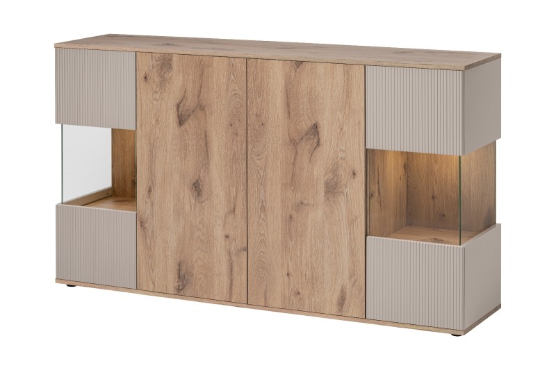 Komoda Catalina to wyjątkowy mebel, który łączy funkcjonalność z efektownym designem. Dzięki przeszklonym frontom z dekoracyjnym ryflowaniem MDF i przestronnemu wnętrzu, pozwala zarówno przechowywać, jak i eksponować najważniejsze przedmioty. Matowe wykończenie w modnych kolorach dąb vicking i kaszmir wprowadza do pomieszczenia elegancki i przytulny klimat. To doskonały wybór do salonu, jadalni czy gabinetu.