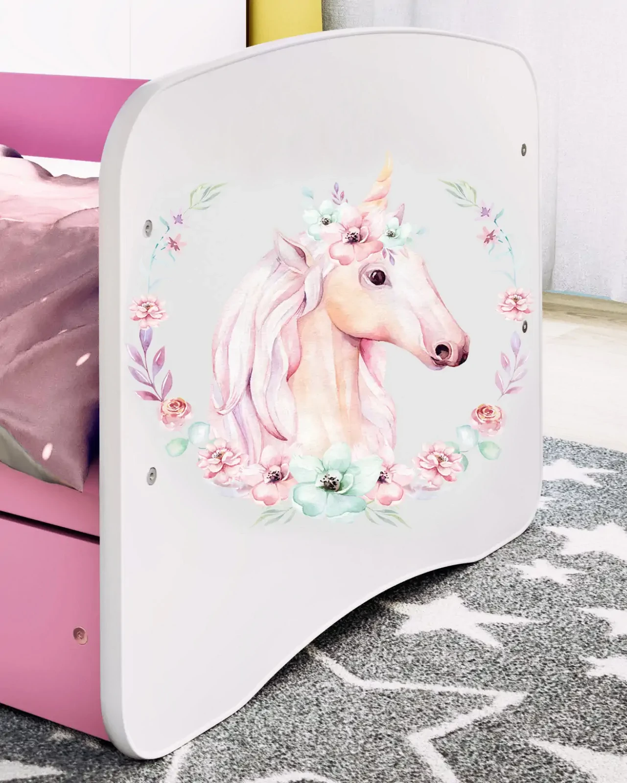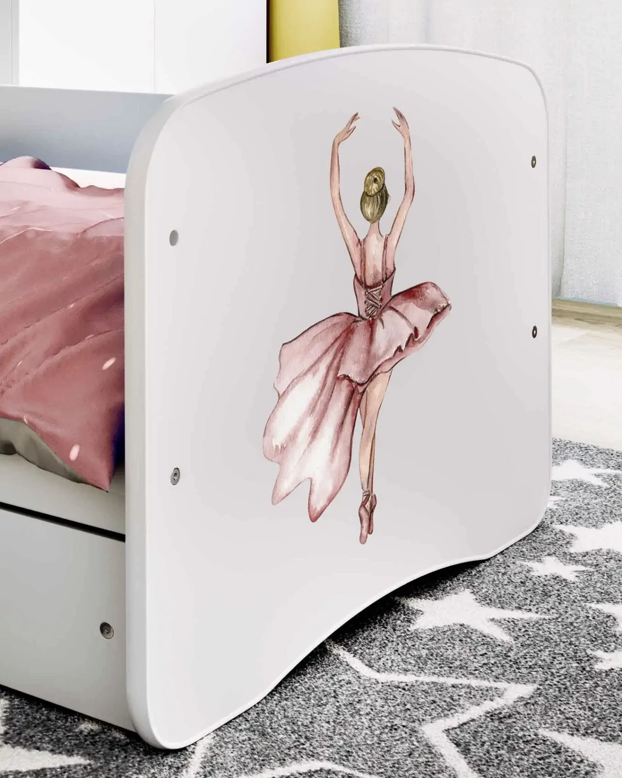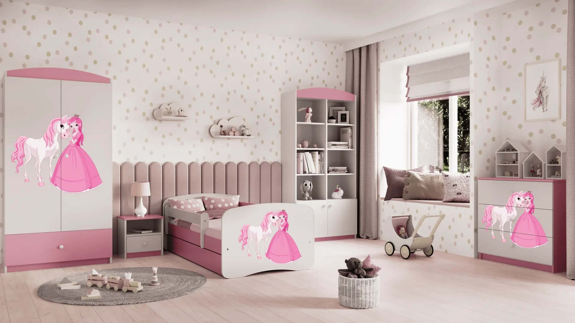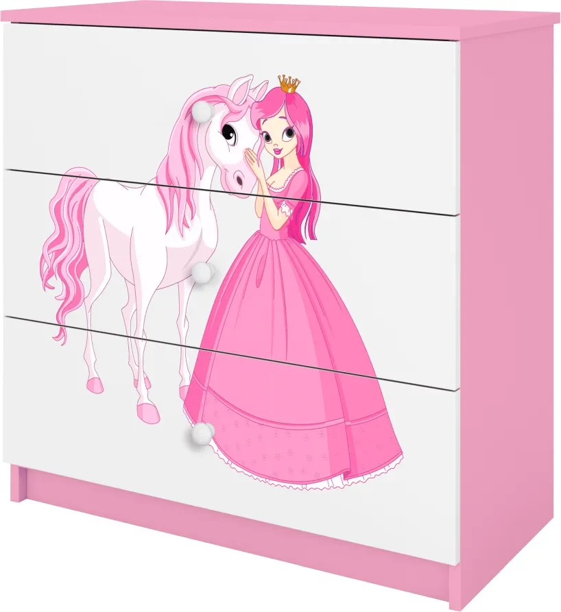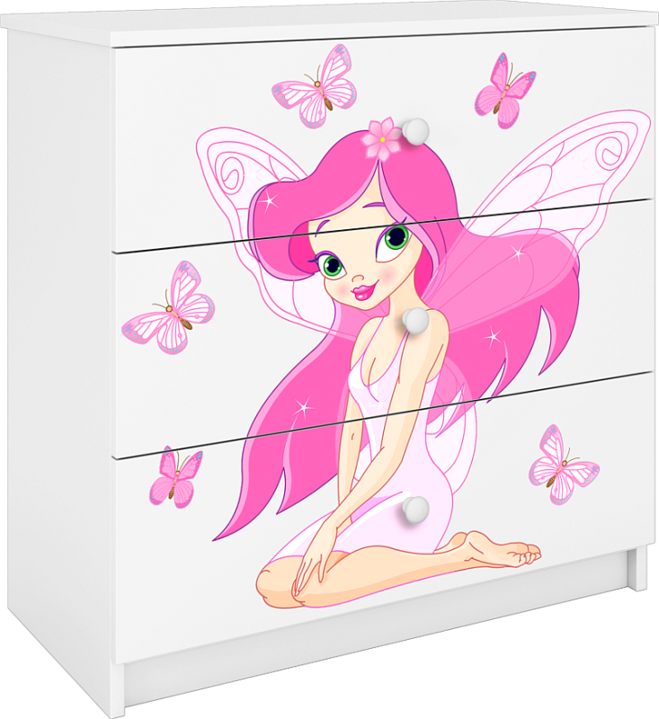 Komoda Babydreams to nowoczesna propozycja 3 szufladowej komody do sypialni z serii mebli do pokoju dziecięcego BABYDREAMS. Korpus komody wykonany został z wysokiej jakości płyty laminowanej w najgrubszym stosowanym rozmiarze czyli 18 mm. Solidna budowa gwarantuje trwałość i bezpieczeństwo użytkowania. Komoda posiada 3 pojemne szuflady o głębokości 34 cm. Komoda Babydreams dostępna jest w kilku kolorach oraz z możliwością wyboru ozdobnej naklejki. Piękny laminowany obrazek jest naniesiony na całej powierzchni frontowej komody, co utrudnia jego zniszczenie lub zerwanie. Obrazek na komodzie pokryty jest laminatem, przez co jest trwały i odporny na środki czyszczące. Poniżej znajduje się paleta naklejek dedykowanych dla dziewczynek.
