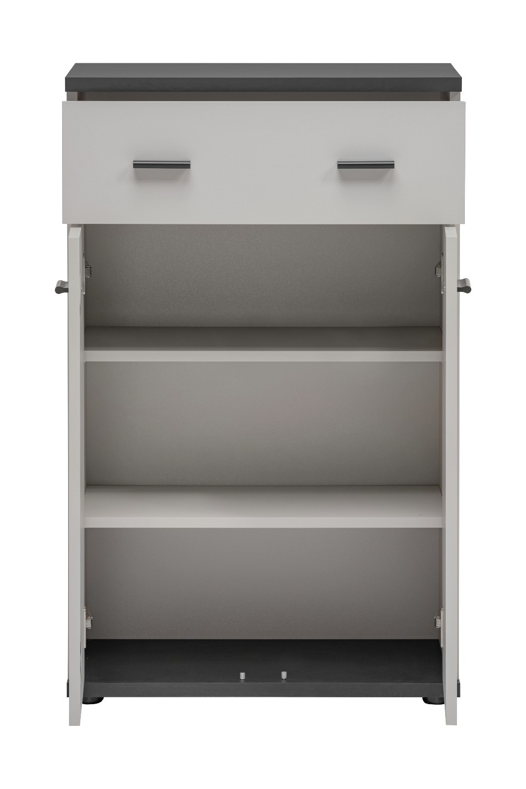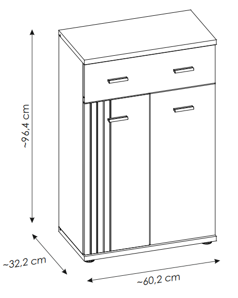 - Układ: Szafka z szufladą, poniżej 2 drzwi, wewnątrz 2 zwykłe półki
