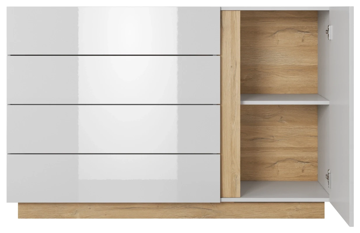 Komoda jednodrzwiowa Arco z szufladami 138 cm biały połysk + dąb grandson