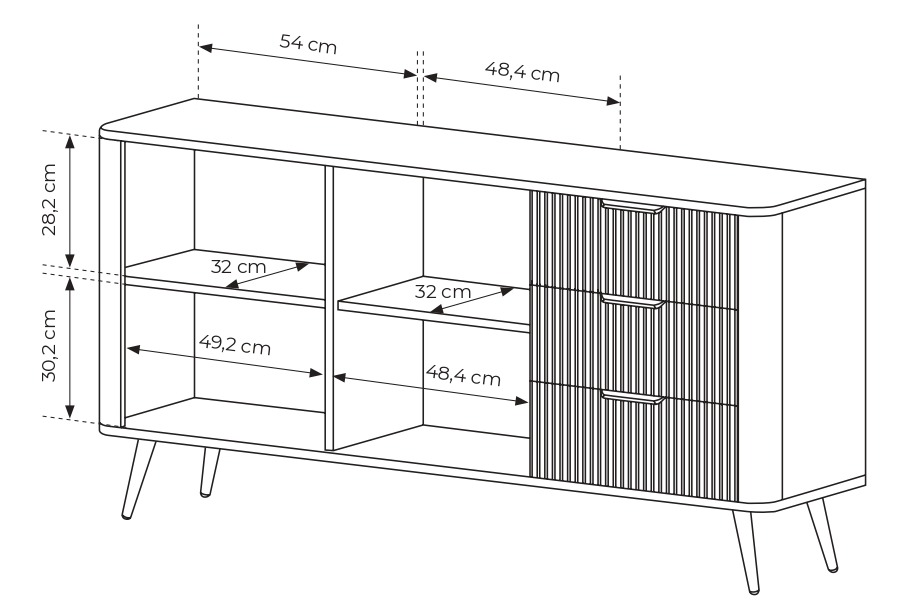 - Korpus: płyta meblowa laminowana E05, 16 mm + zaoblona listwa MDF