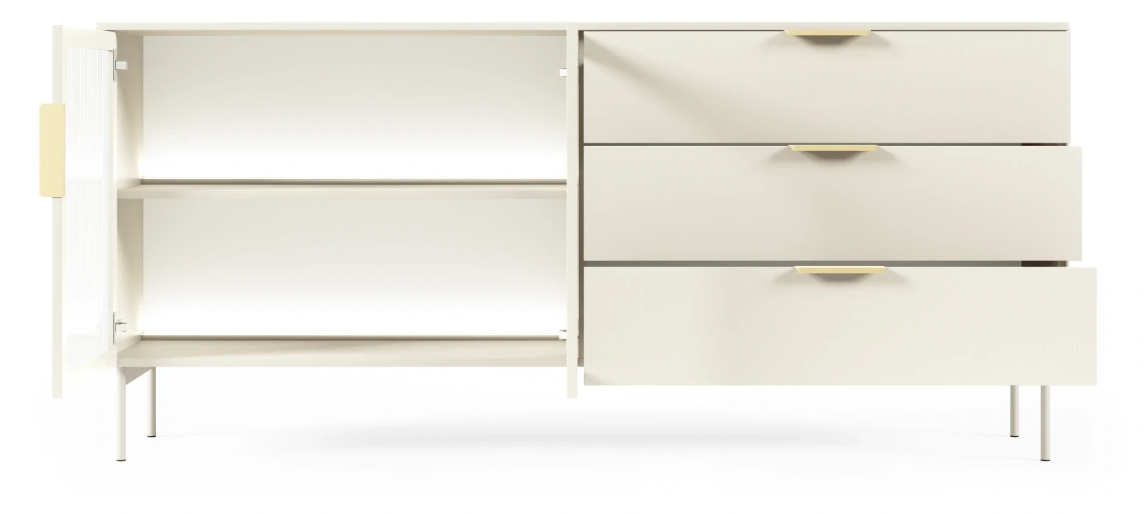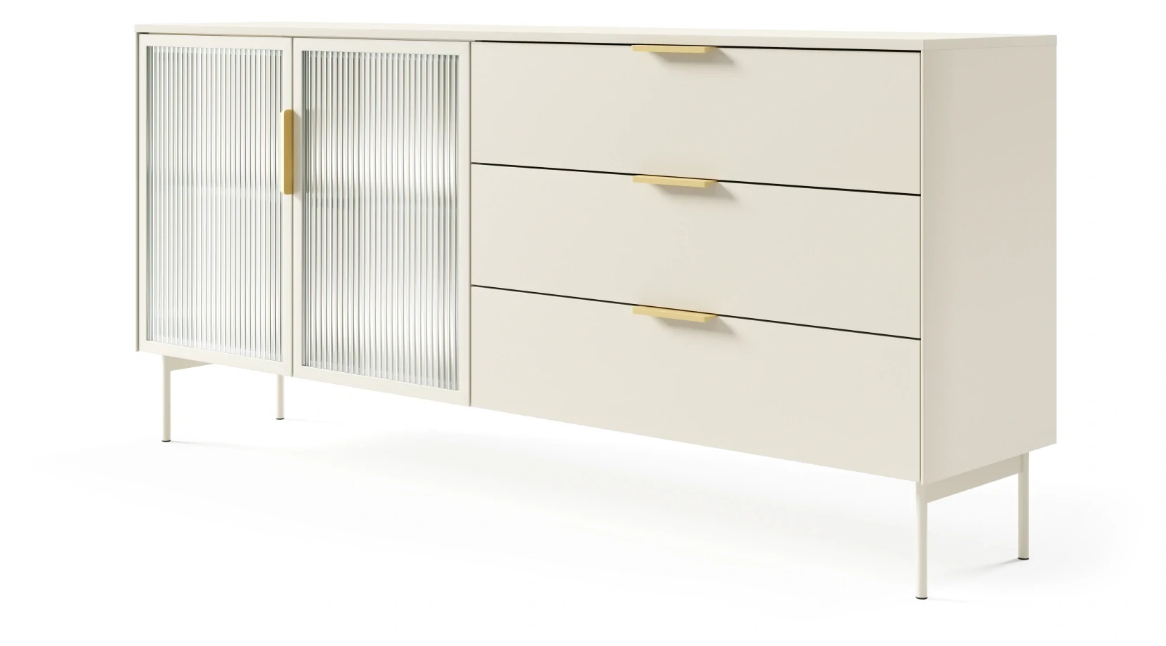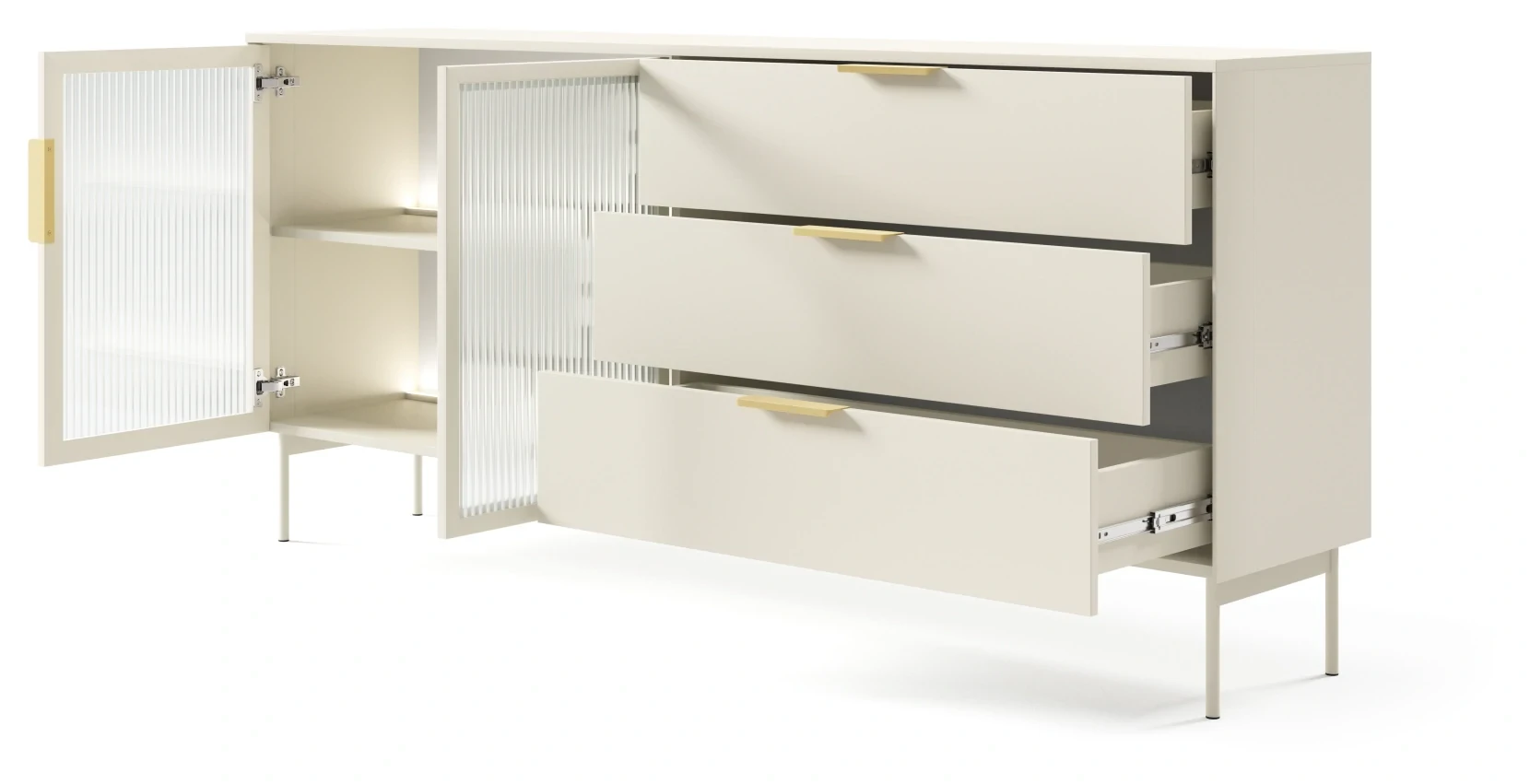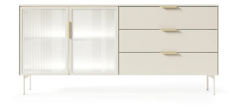Stylowa komoda z kolekcji LUMI kaszmir to mebel, który świetnie sprawdzi się w salonie. Wyposażona w dwie pojemne szafki i trzy szuflady z pełnym wysuwem, zapewnia dużą przestrzeń do przechowywania. Przeszklone fronty z ornamentowym szkłem flutes i subtelne oświetlenie LED w neutralnej barwie bieli tworzą wyjątkowy efekt wizualny. Mebel został zaprojektowany i wykonany w Polsce co jest gwarancją jakości - Wspieraj