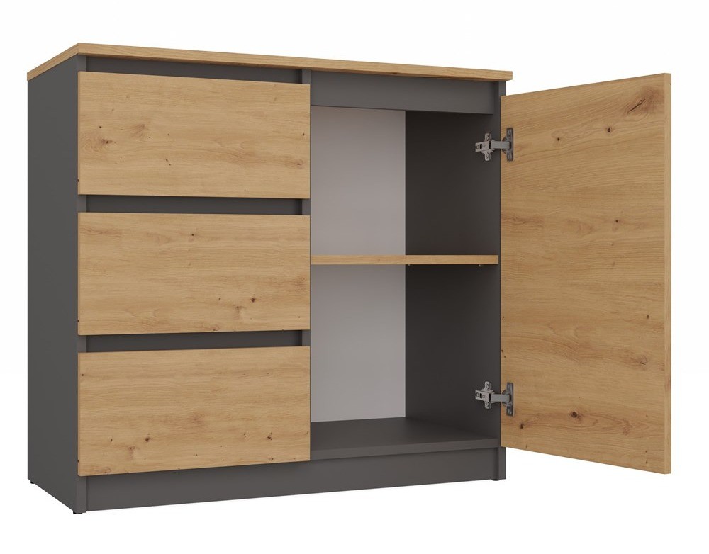 Komoda Malwa 1D3S antracyt/dąb artisan to stylowy i funkcjonalny mebel, który sprawdzi się zarówno w salonie, sypialni, jak i pokoju młodzieżowym. Połączenie głębokiego antracytu z ciepłym dekorem dąb artisan nadaje jej nowoczesny, a jednocześnie przytulny charakter. Dzięki przemyślanemu układowi z półką i trzema pojemnymi szufladami komoda ułatwia przechowywanie i organizację, pomagając utrzymać porządek na co dzień.