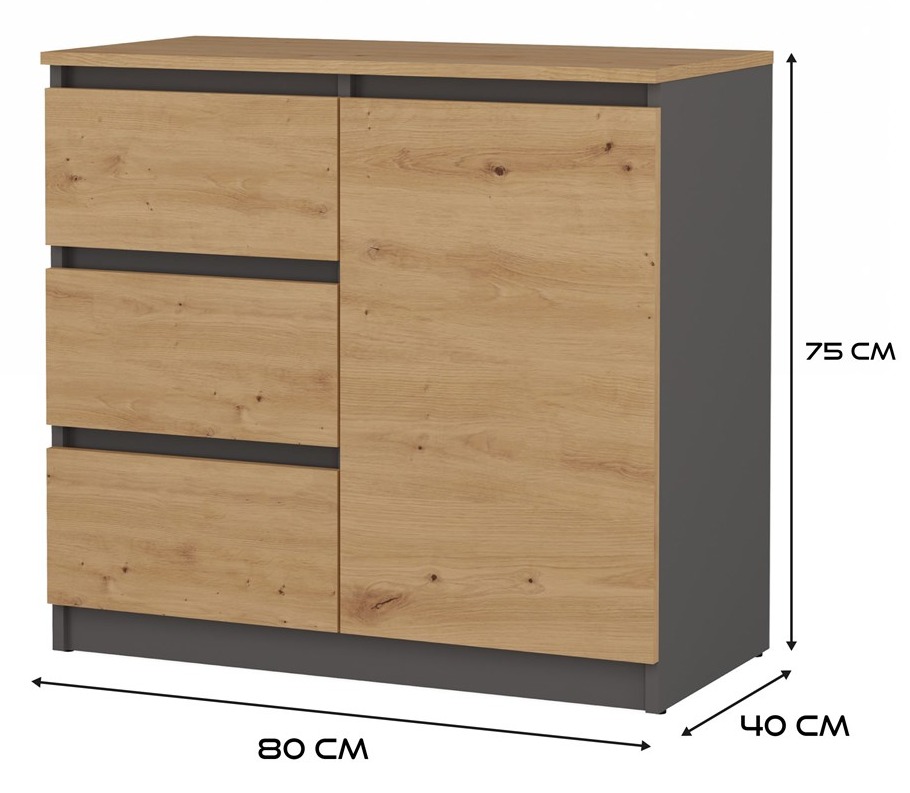 Komoda Malwa 1D3S jednodrzwiowa z 3 szufladami do salonu 80 cm antracyt/dąb artisan/blat dąb artisan